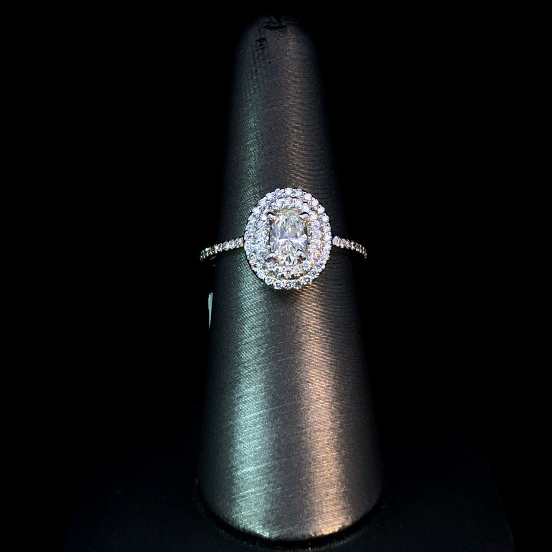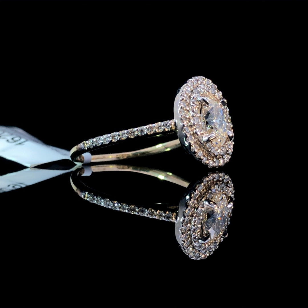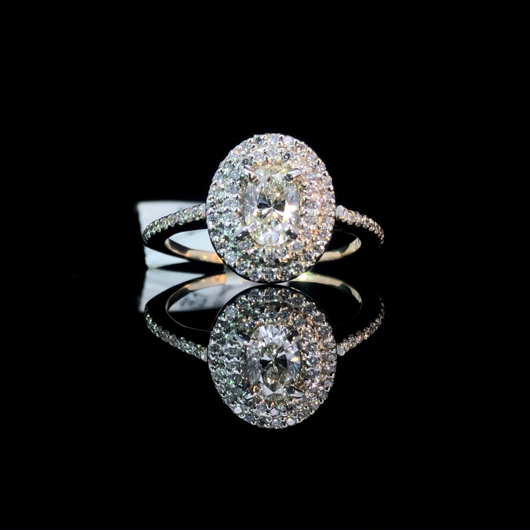 This stunning 1.00 ctw diamond ring features a sparkling .66 ct oval diamond set in a .34 ctw diamond double halo semi mount, all crafted in 2 tone 14 kt gold. Elevate your style and add a touch of sophistication with this exquisite piece. Ring is a size 6.5 and first time sizing is free at the time of purchase. Additional sizing fees may apply.