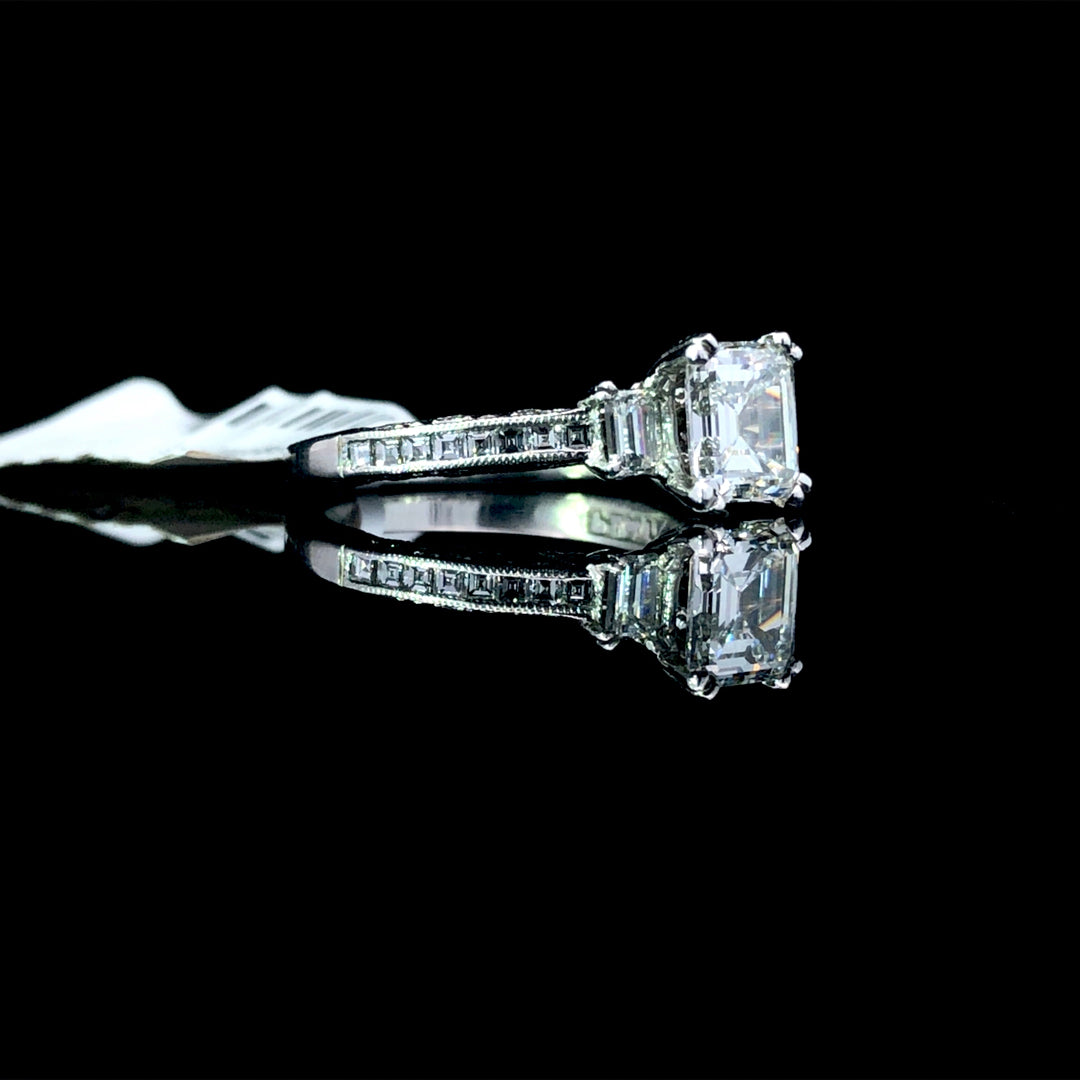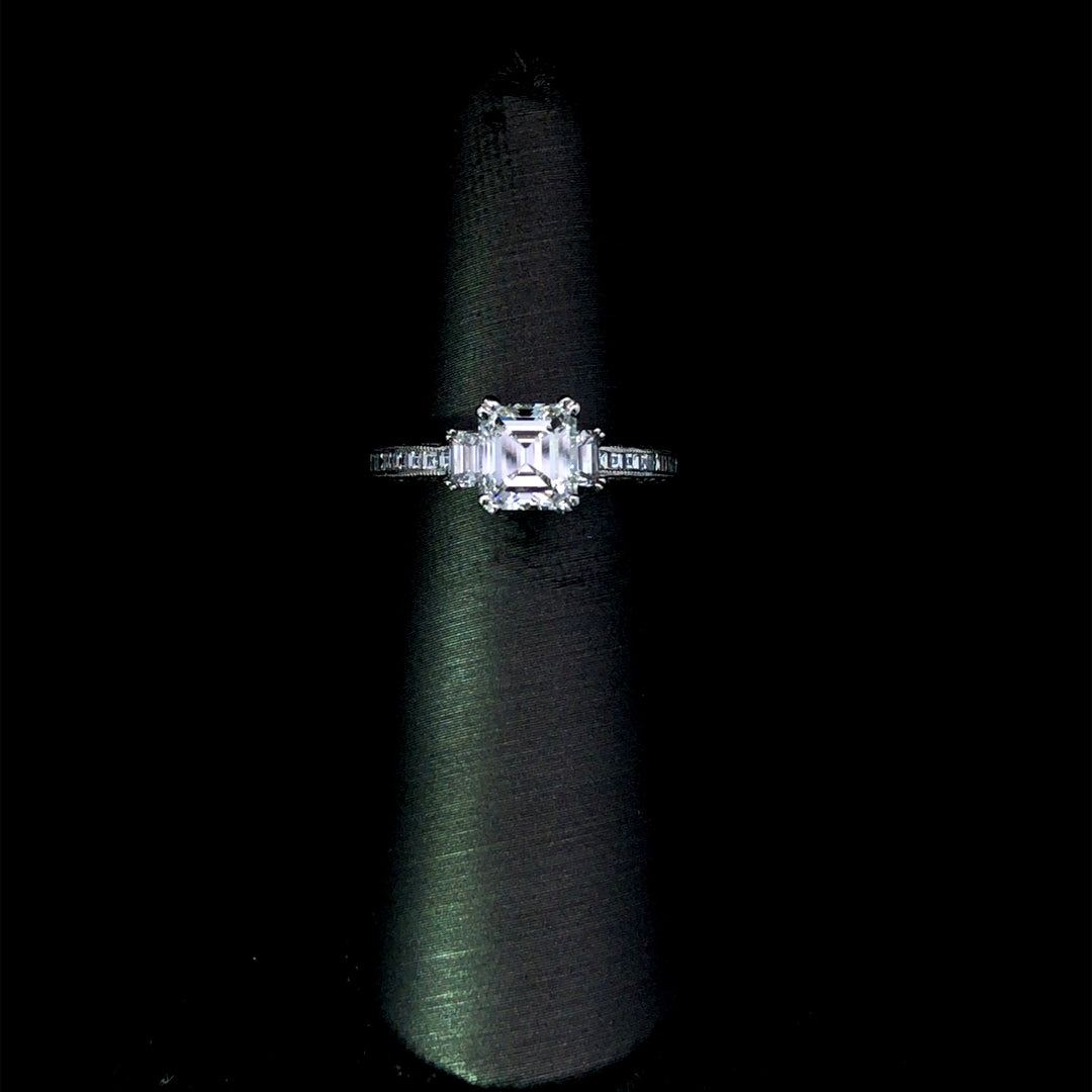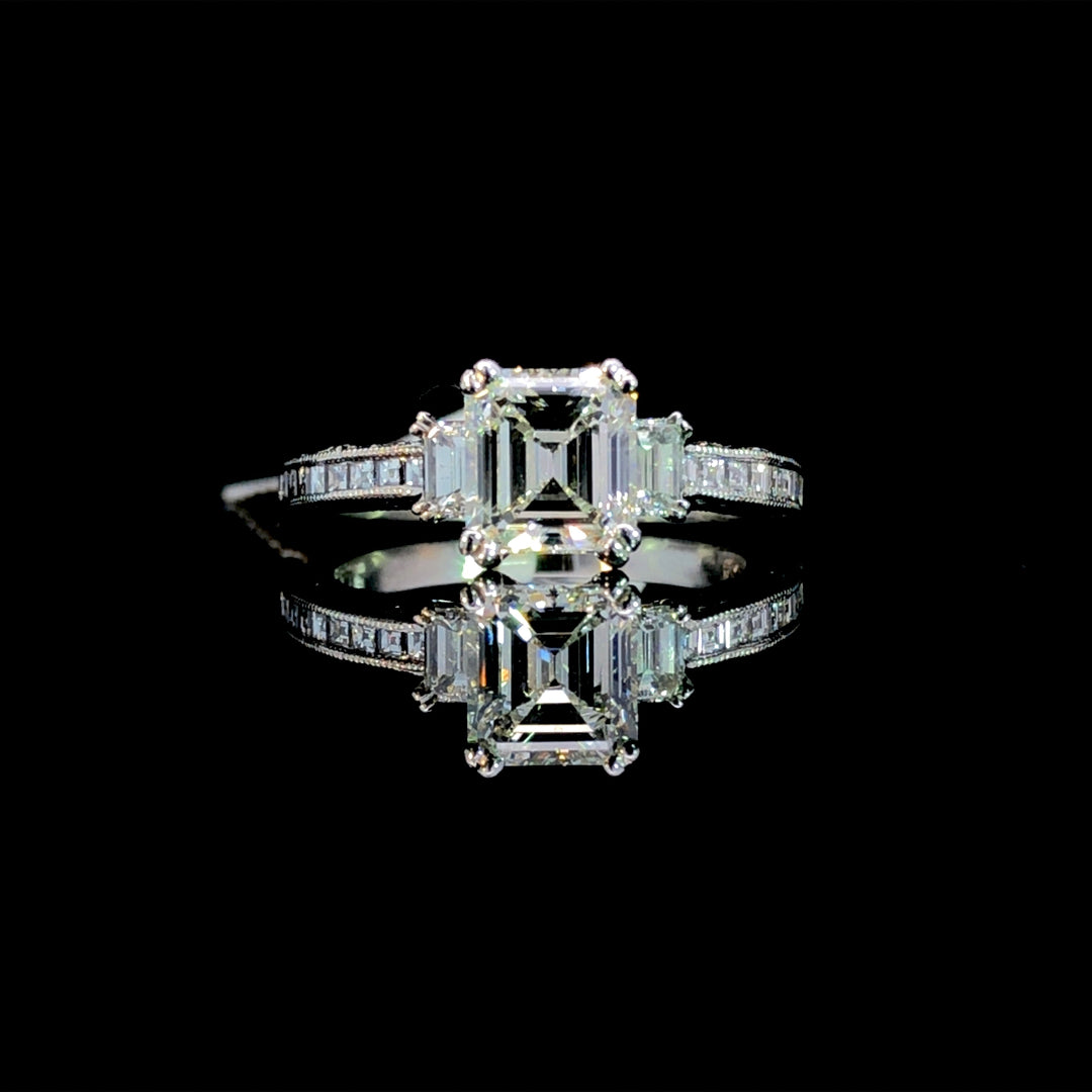 Elevate your style with our 1.93 ctw diamond ring featuring a stunning 1.23 ct emerald cut diamond, nestled in a platinum semi mount encrusted with .70 ctw of diamonds. Embrace luxury and exclusivity with this timeless piece that exudes sophistication and elegance. Ring is a size 5.75