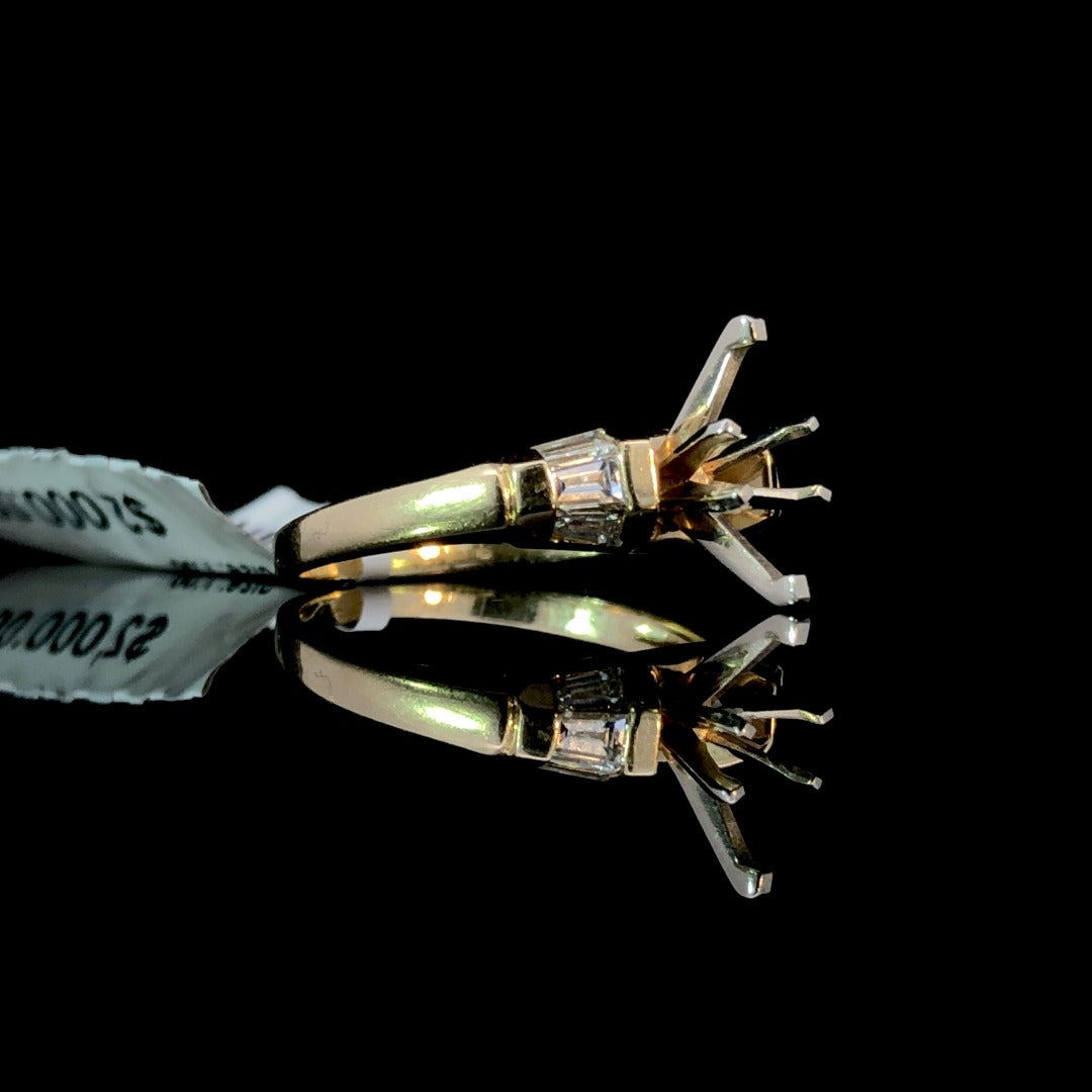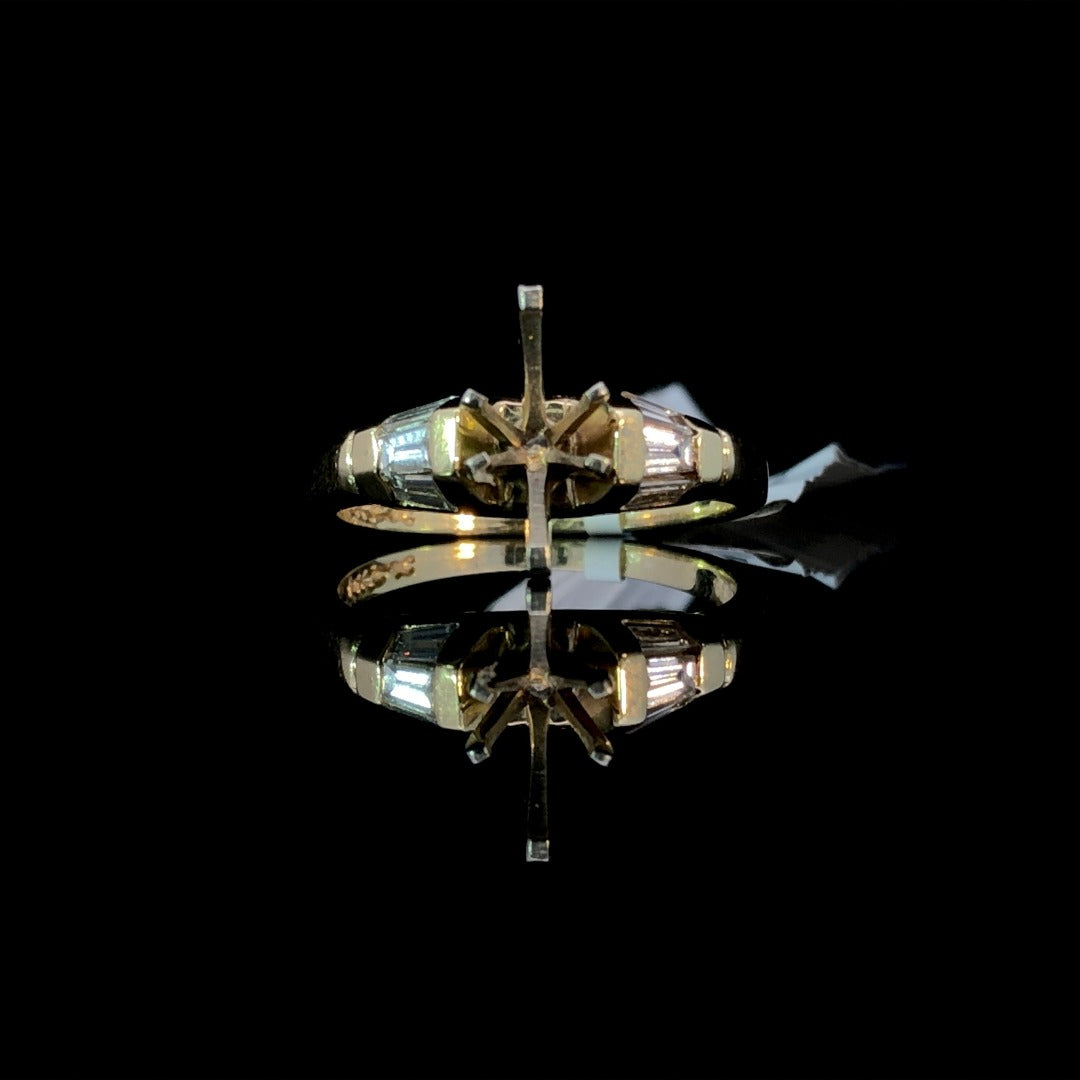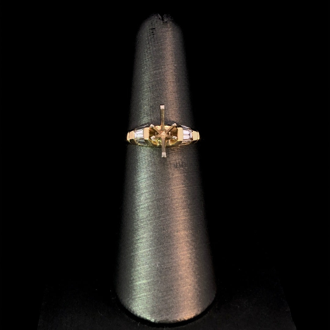 Indulge in timeless elegance with our classic diamond semi mount. Crafted with .39ctw of baguette diamond side stones in 14kt yellow gold, this piece offers sophistication and versatility. Personalize it with your choice of center stone from our wide selection for a truly unique and luxurious accessory. Price is for the semi mount only. Center stone will be added at an additional cost. This ring is a size 7. If that size is not a perfect fit, first time sizing is free at the time of purchase. Additional sizing fees may apply.