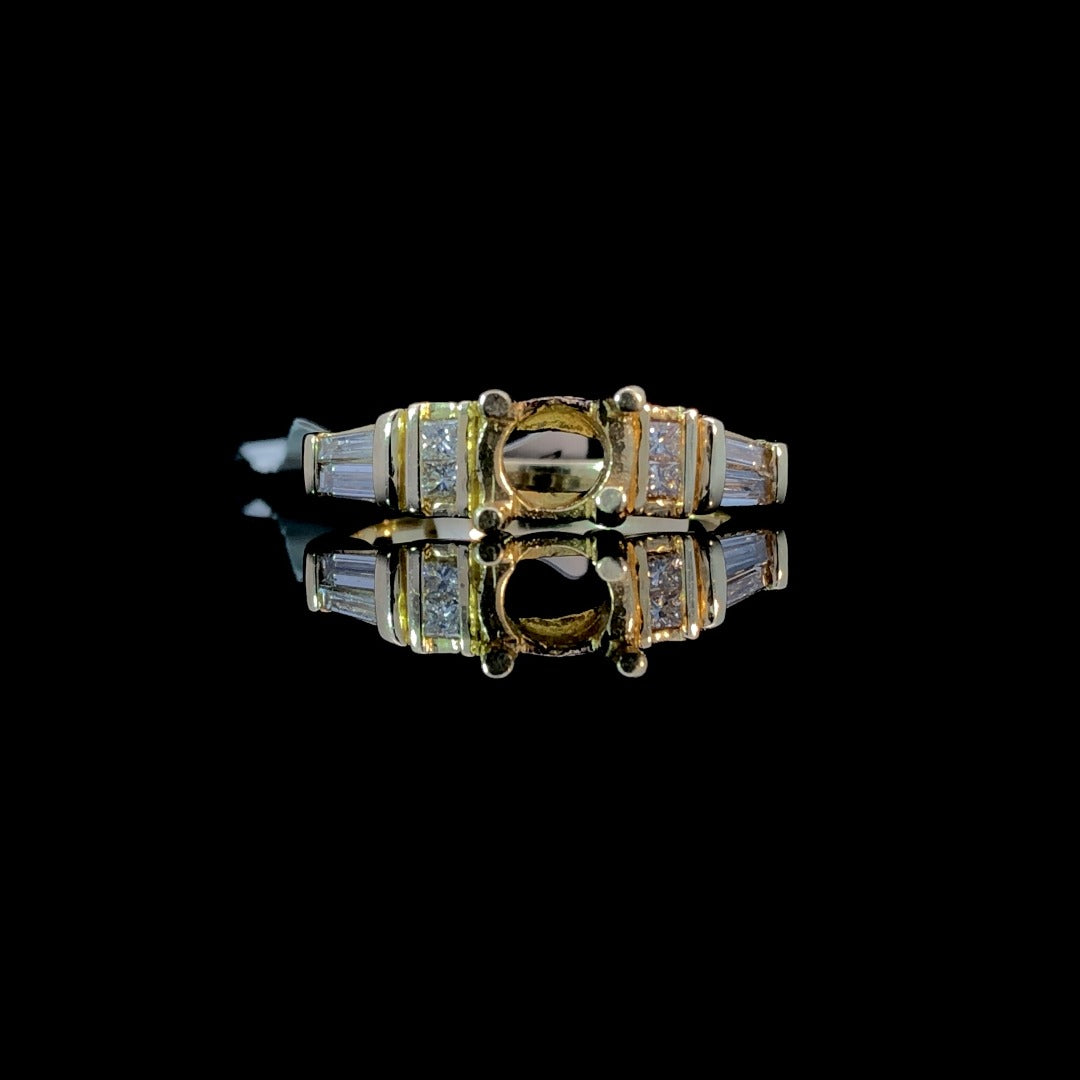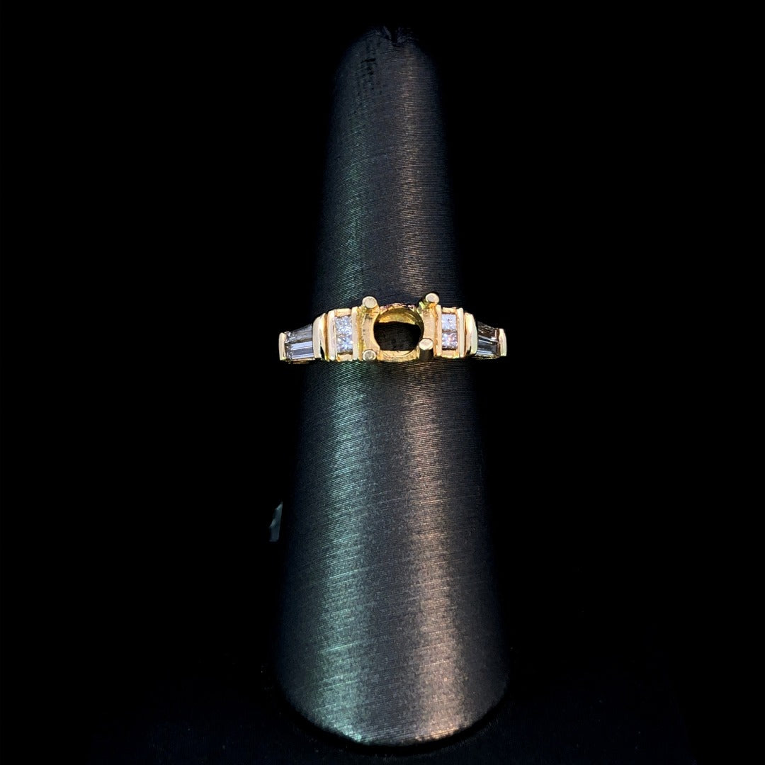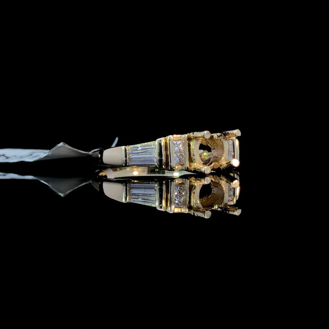 Introducing our stunning diamond semi mount, with .38ctw of princess cut and baguette diamonds set in warm, 14kt yellow gold. Create your dream piece by choosing a center stone from our vast selection of loose stones. Elevate your style with this exclusive and elegant design. Price is for the semi mount only. Center stone will be added at an additional cost. This ring is a size 6.5. If that size is not a perfect fit, first time sizing is free at the time of purchase. Additional sizing fees may apply.