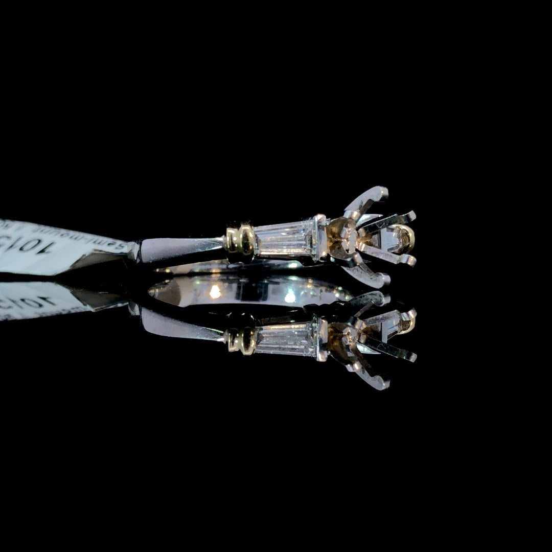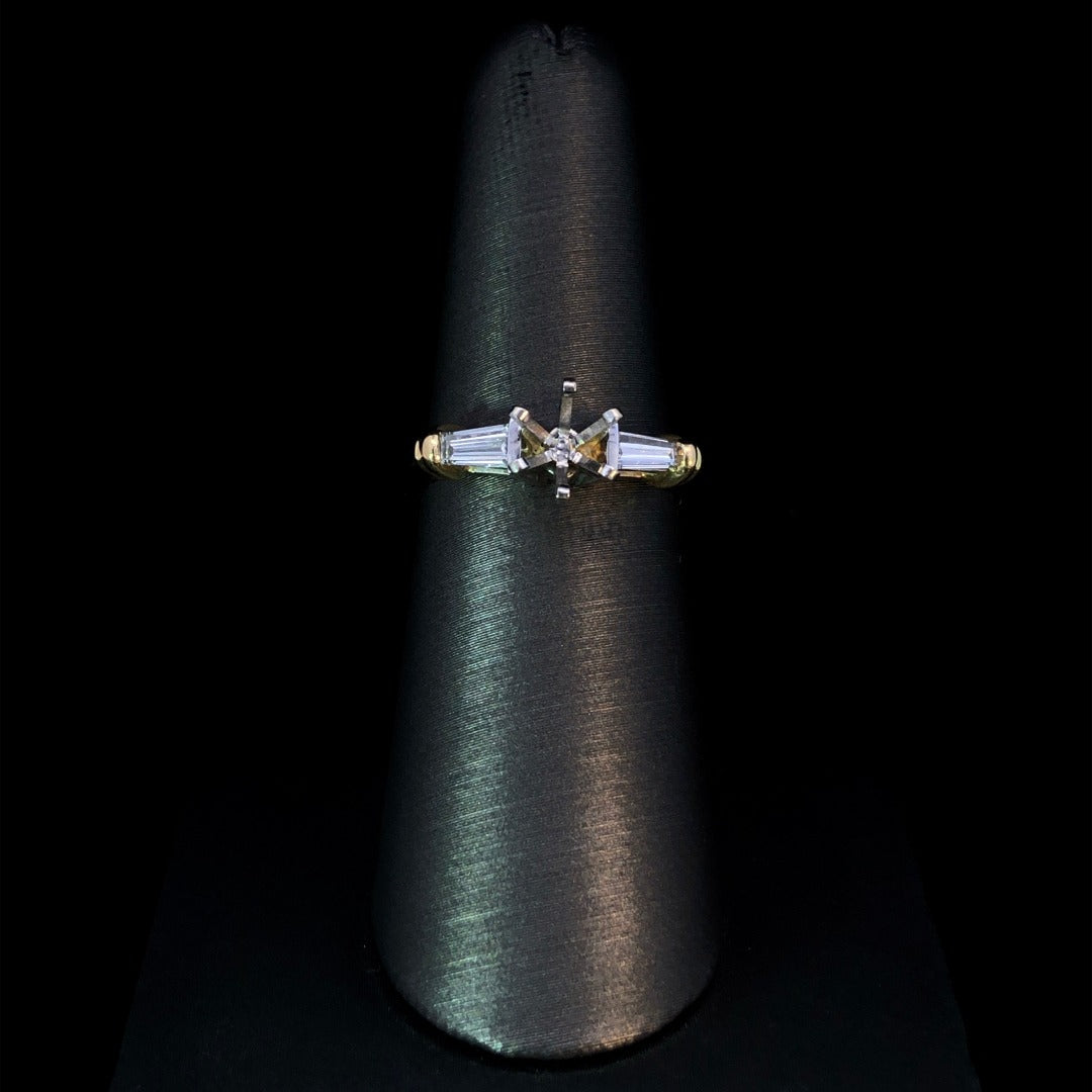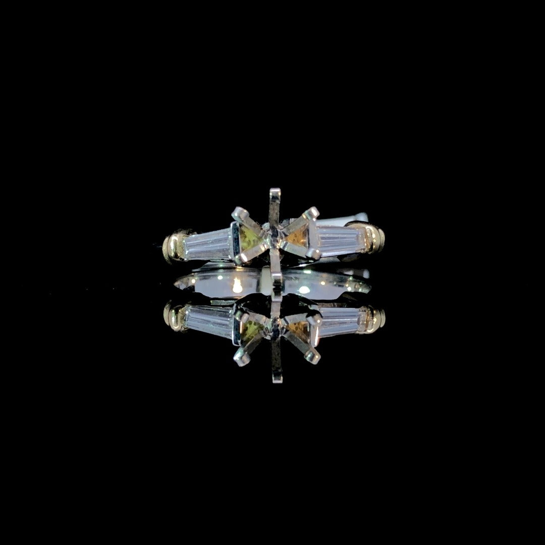 This exquisite diamond semi mount boasts a timeless design infused with contemporary flair. Adorned with 2 striking baguette side stones totaling .32ctw, nestled between sleek yellow gold bars on a white gold shank. Personalize it by selecting your own center stone from our wide array of loose stones. Price is for the semi mount only. Center stone will be added at an additional cost. This ring is a size 6.5. If that size is not a perfect fit, first time sizing is free at the time of purchase. Additional sizing fees may apply.