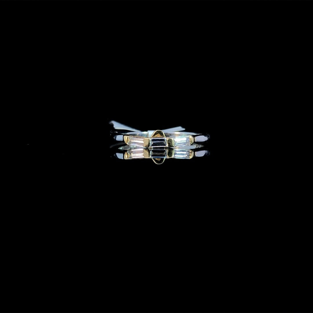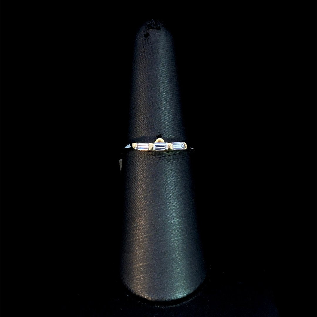 Say goodbye to gapping and hello to a flawless fit with this 18kt yellow gold and platinum contour band! Featuring 3 sparkling baguette diamonds totaling .30ctw set in yellow gold, and a platinum band, this ring ensures a seamless look for your engagement ring. This ring is a size 6. If that size is not a perfect fit, first time sizing is free at the time of purchase. Additional sizing fees may apply.