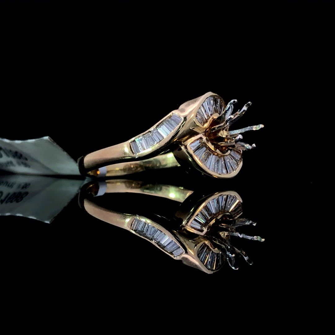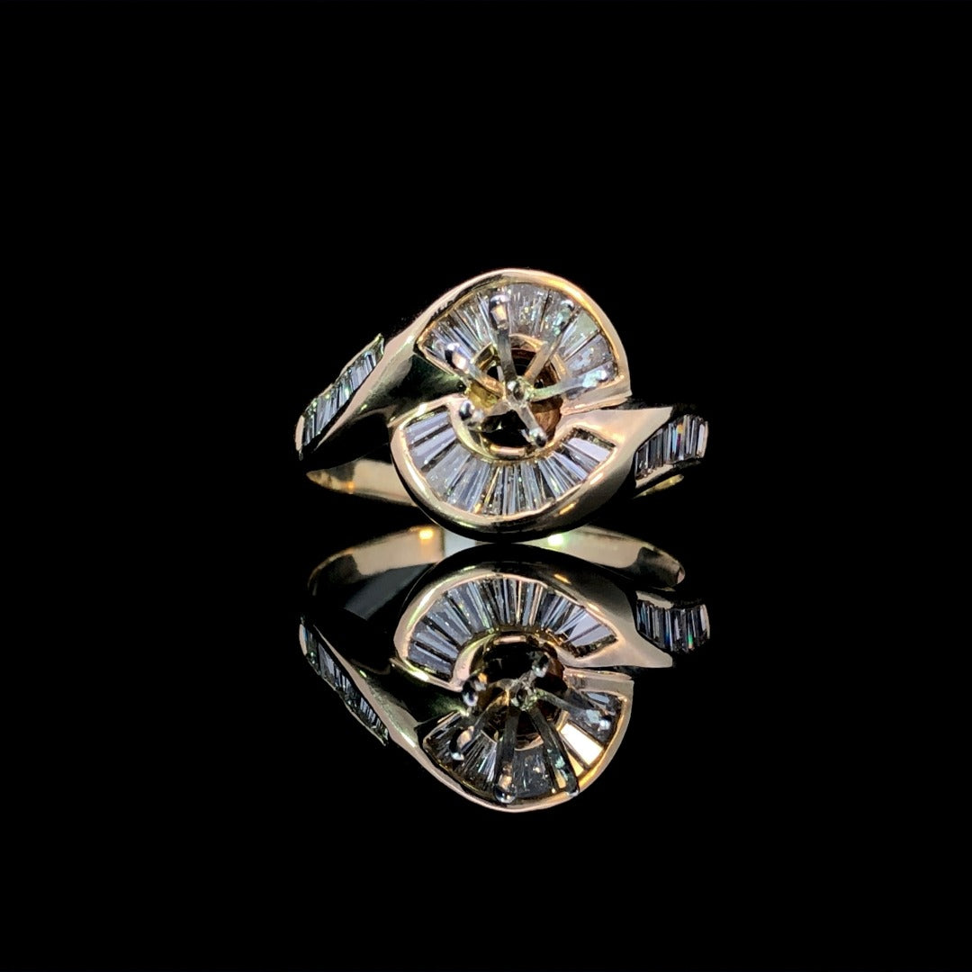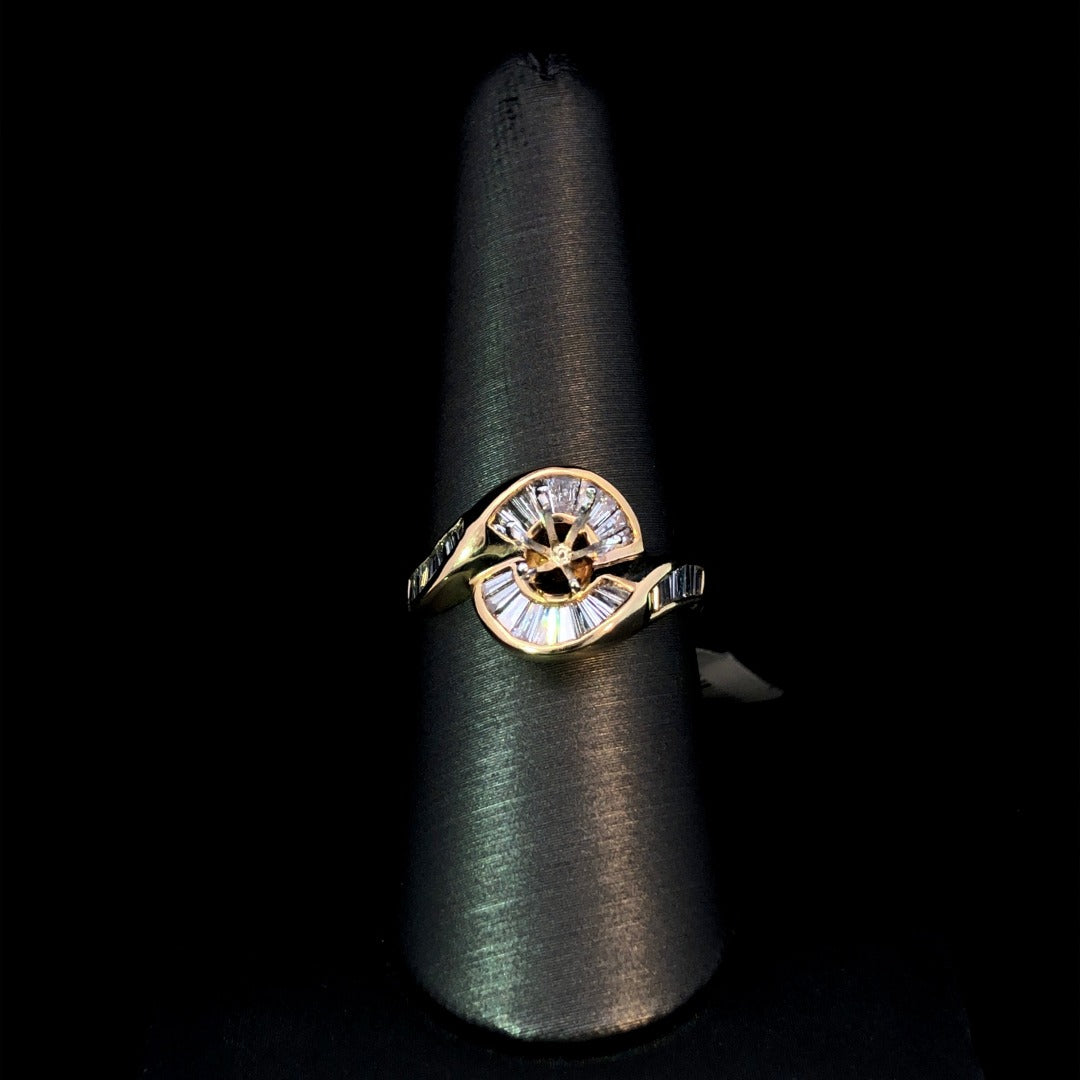 Elevate your jewelry collection with our 14kt yellow gold diamond semi mount, featuring a stunning swirl design adorned with .85ctw of baguette diamonds. Complete this luxurious piece with the center stone of your choice from our exquisite selection. Make it truly yours. Price is for the semi mount only. Center stone will be added at an additional cost. This ring is a size 8.25. If that size is not a perfect fit, first time sizing is free at the time of purchase. Additional sizing fees may apply.