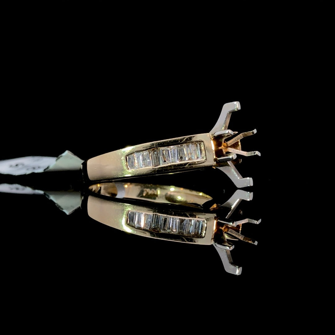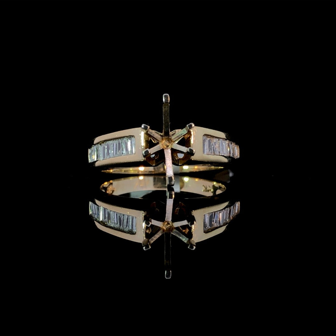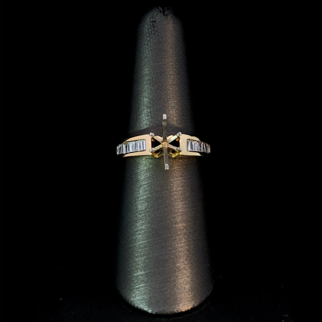 Upgrade your jewelry collection with our 14kt yellow gold semi mount ring featuring .33ctw of sparkling baguette diamonds. Personalize it with your choice of center stone from our wide selection for a truly one-of-a-kind piece! Price is for the semi mount only. Center stone will be added at an additional cost. This ring is a size 7. If that size is not a perfect fit, first time sizing is free at the time of purchase. Additional sizing fees may apply.