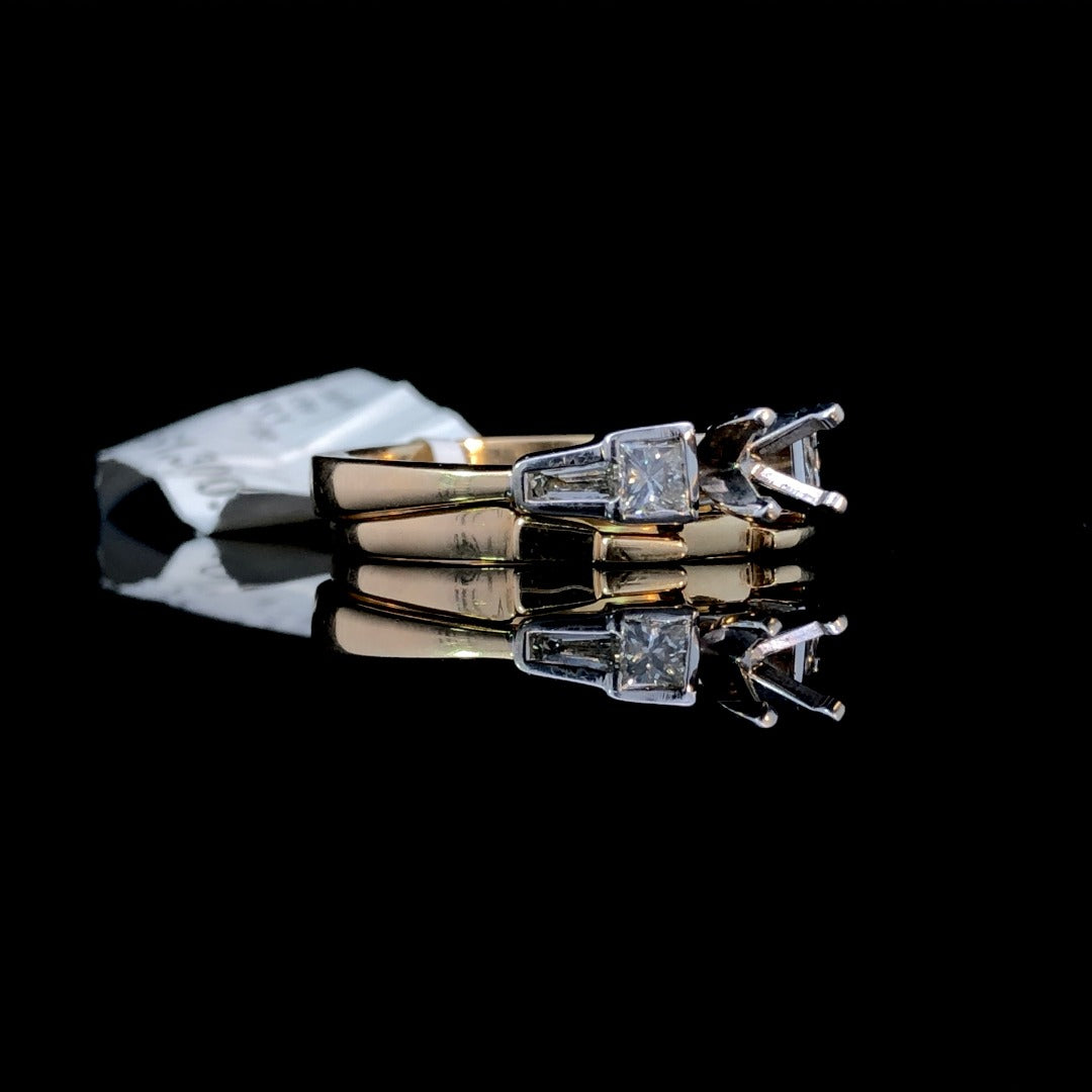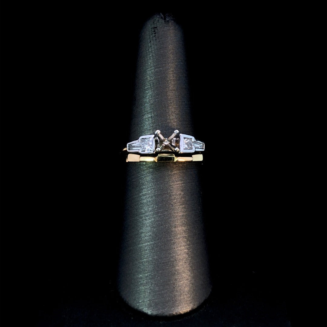 Indulge in luxury with our gorgeous diamond semi mount set. The 2-tone 14kt yellow and white gold design showcases .40ctw of princess and baguette diamonds, elevating this classic piece to a work of art. Complete the look with a center stone from our selection of loose stones and the perfectly designed flush gold band. Price is for the semi and band only. Center stone will be added at an additional cost. This is a size 7. If that size is not a perfect fit, first time sizing is free at the time of purchase. Additional sizing fees may apply.