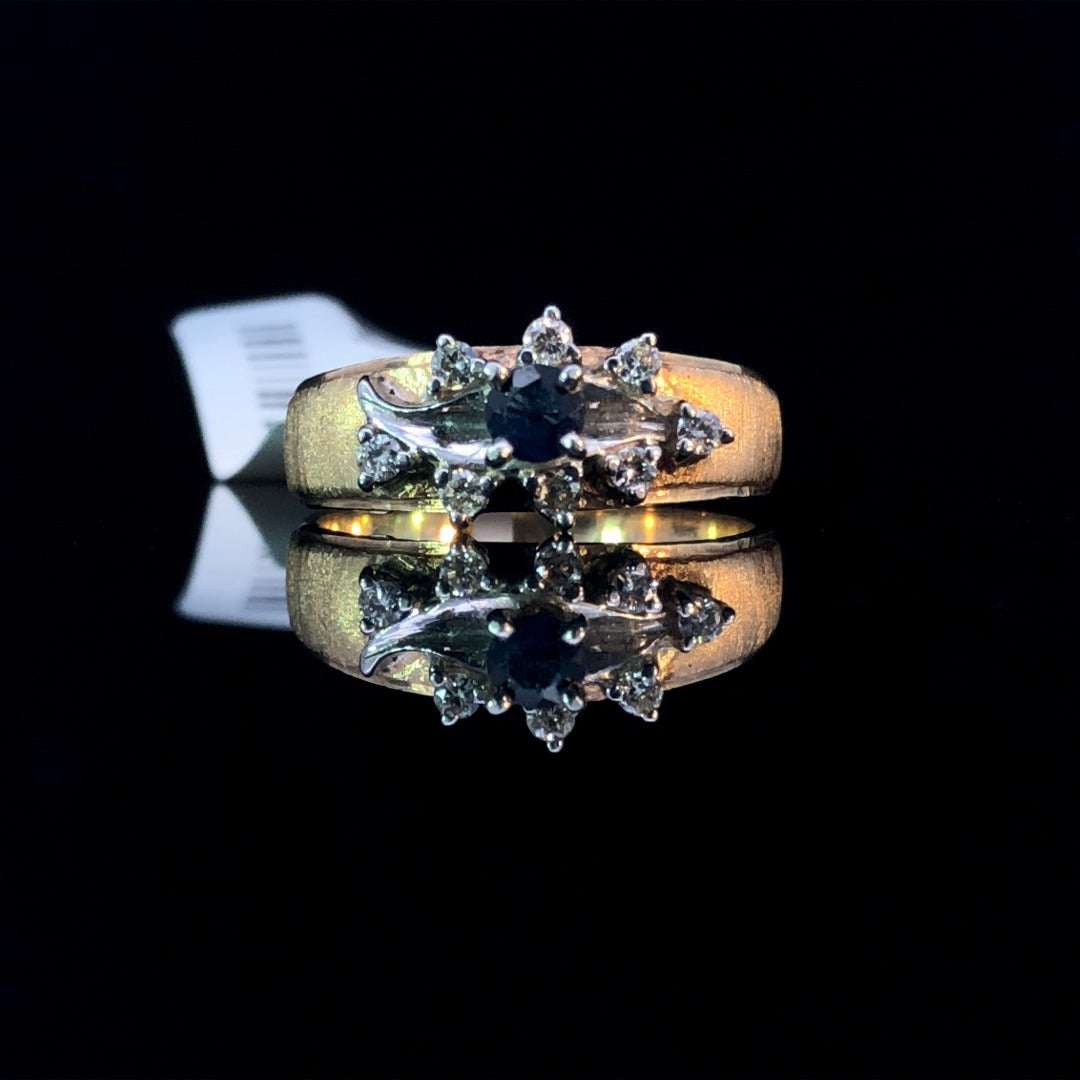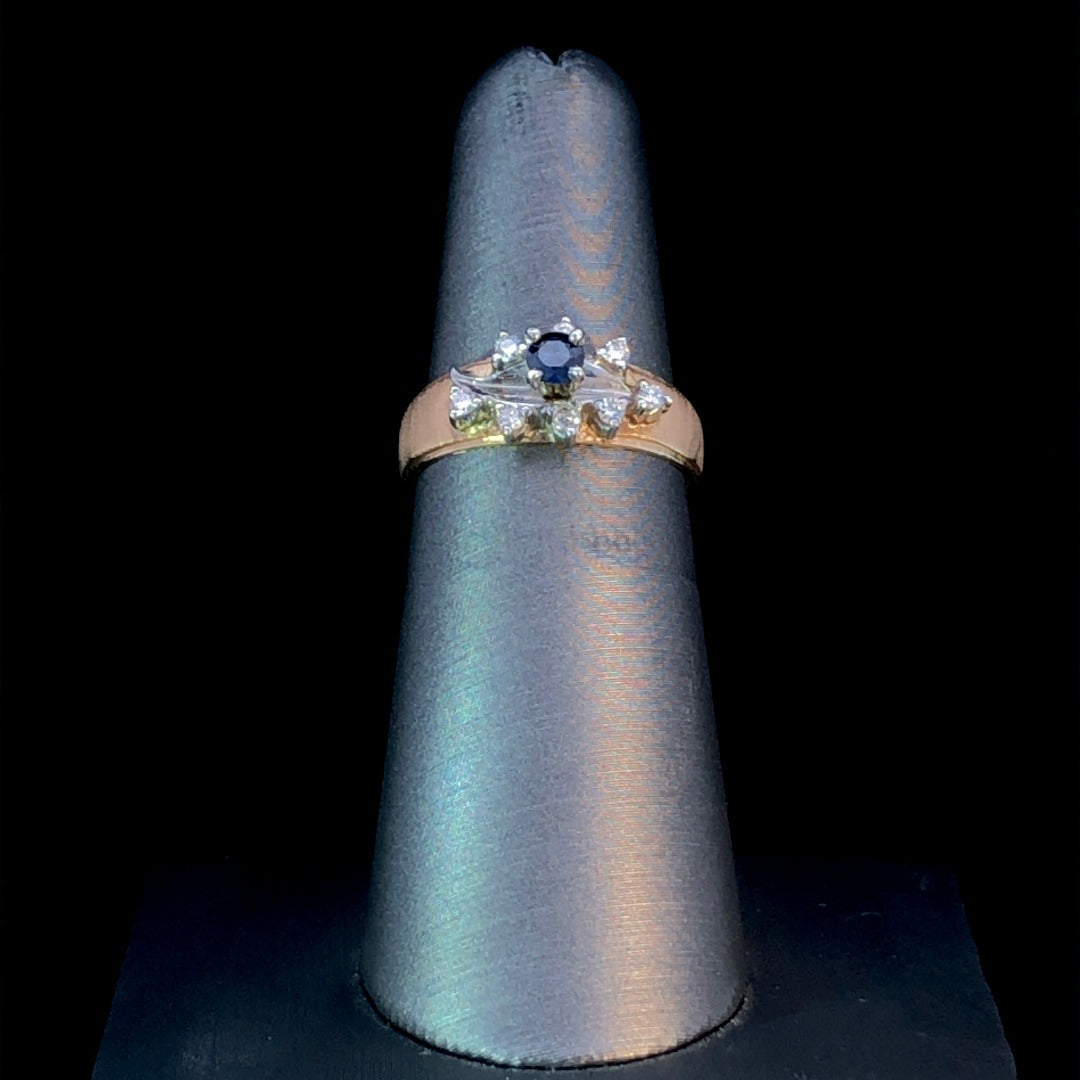 This exquisite piece of jewelry showcases the beauty of sapphires and diamonds. The .16 ctw sapphire and diamond ring is set in a 14 kt 2 tone gold, giving it a luxurious and classic aesthetic that will always make a statement. Make it the perfect gift for someone special, or a beautiful addition to your own collection. This ring is a size 7. If that size is not a perfect fit, first time sizing is free at the time of purchase. Additional sizing fees may apply.