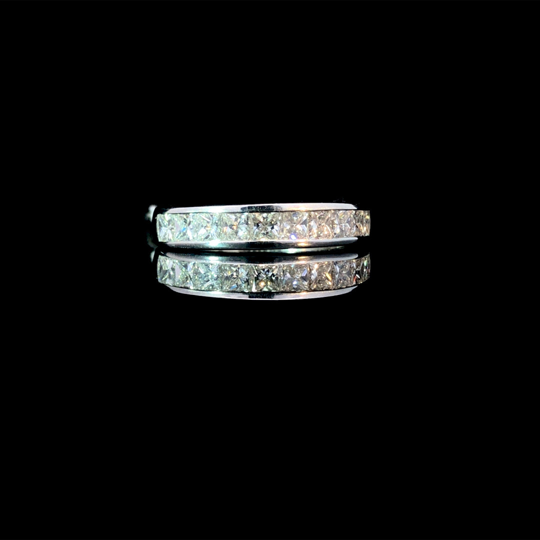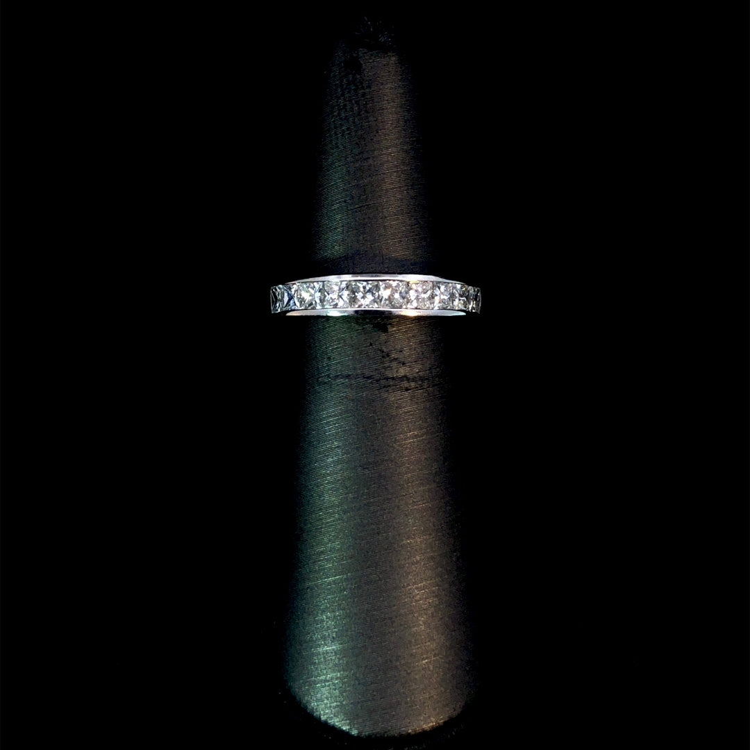 This stunning diamond band boasts 1.00ctw of princess cut diamonds set in platinum. Elevate any outfit with its timeless elegance and shine. Perfect for special occasions or everyday wear, this band is sure to add a touch of luxury to any look. This ring is a size 5.5. If that size is not a perfect fit, first time sizing is free at the time of purchase. Additional sizing fees may apply.