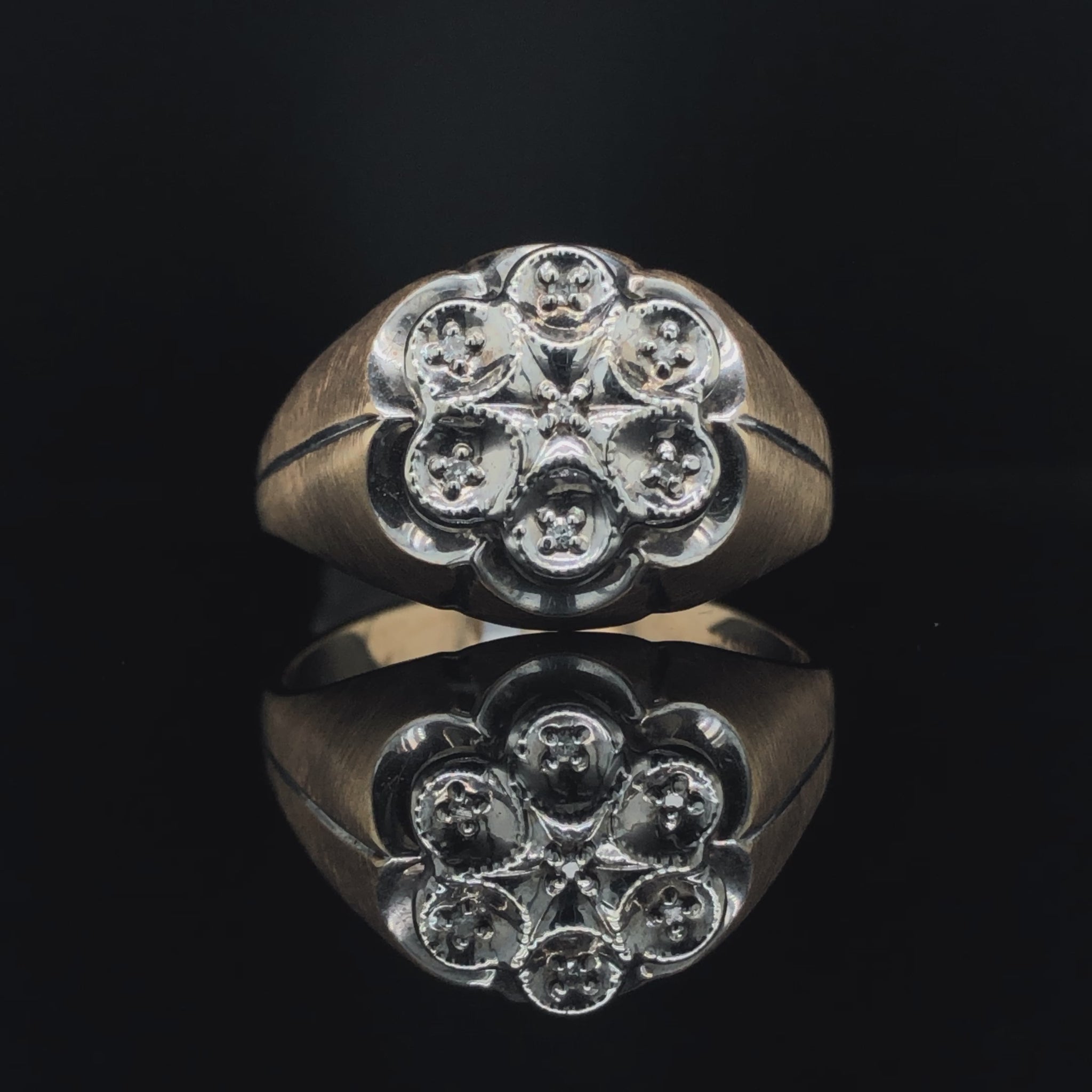 This stunning 10 kt yellow gold diamond ring displays 7 brilliant stones, elegantly nestled in a classic cluster setting. Adorn yourself with a timeless piece of luxury that will keep you sparkling in any occasion. This ring is a size 10. If that size is not a perfect fit, first time sizing is free at the time of purchase. Additional sizing fees may apply.
