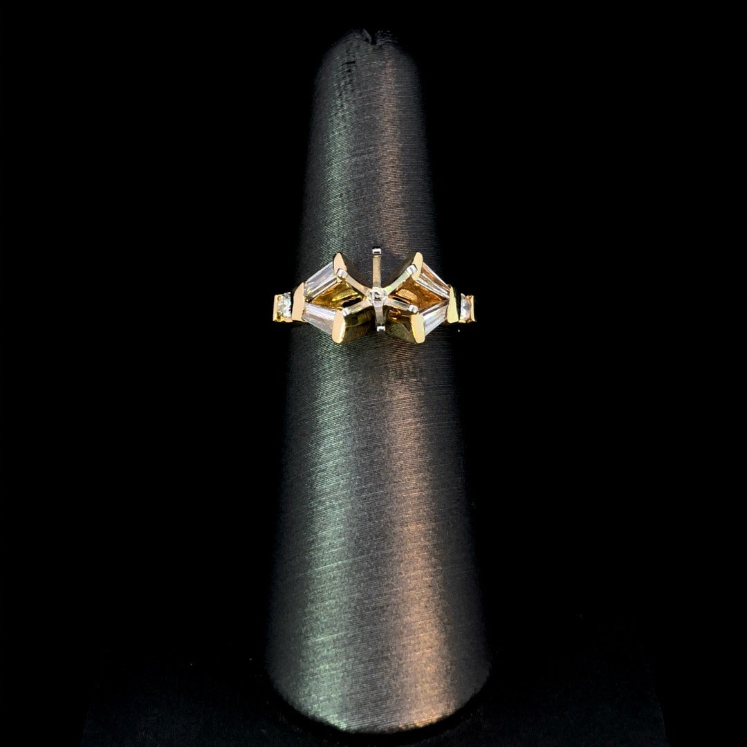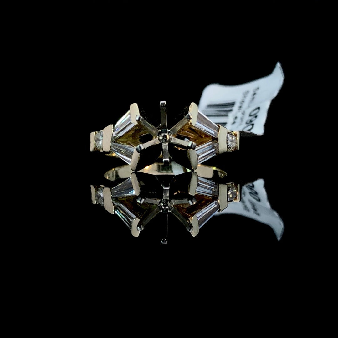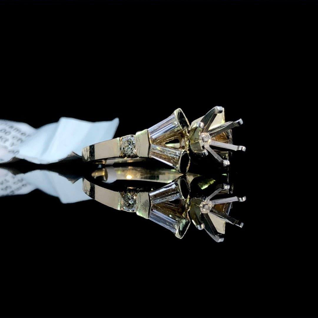 Experience the timeless elegance of this diamond semi mount. With 1.00ctw of round and baguette diamonds set in 14kt yellow gold, this piece radiates luxury. Personalize with your choice of center stone from our wide selection for a one-of-a-kind accessory. Price is for the semi mount only. Center stone will be added at an additional cost. This ring is a size 7. If that size is not a perfect fit, firs time sizing is free at the time of purchase. Additional sizing fees may apply.