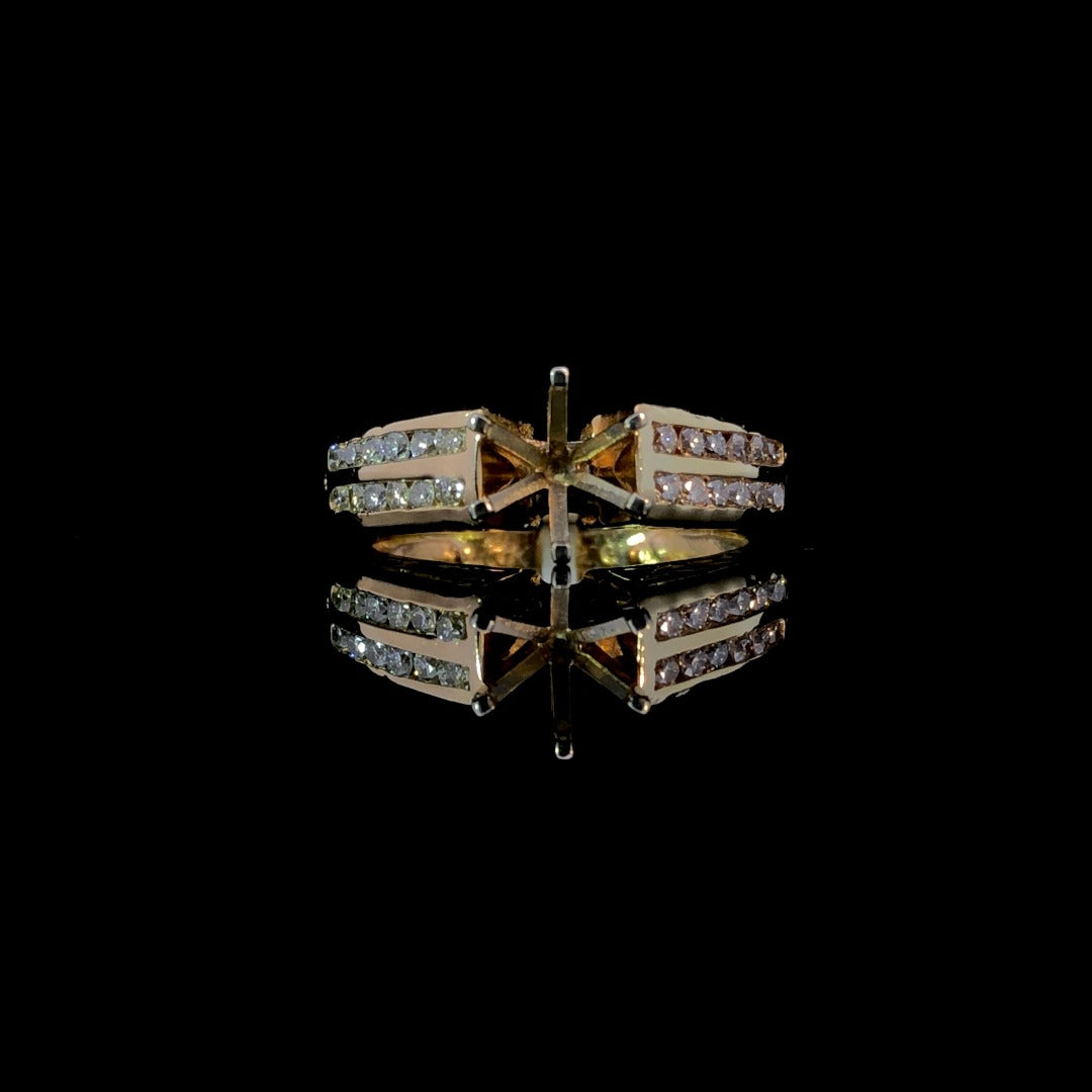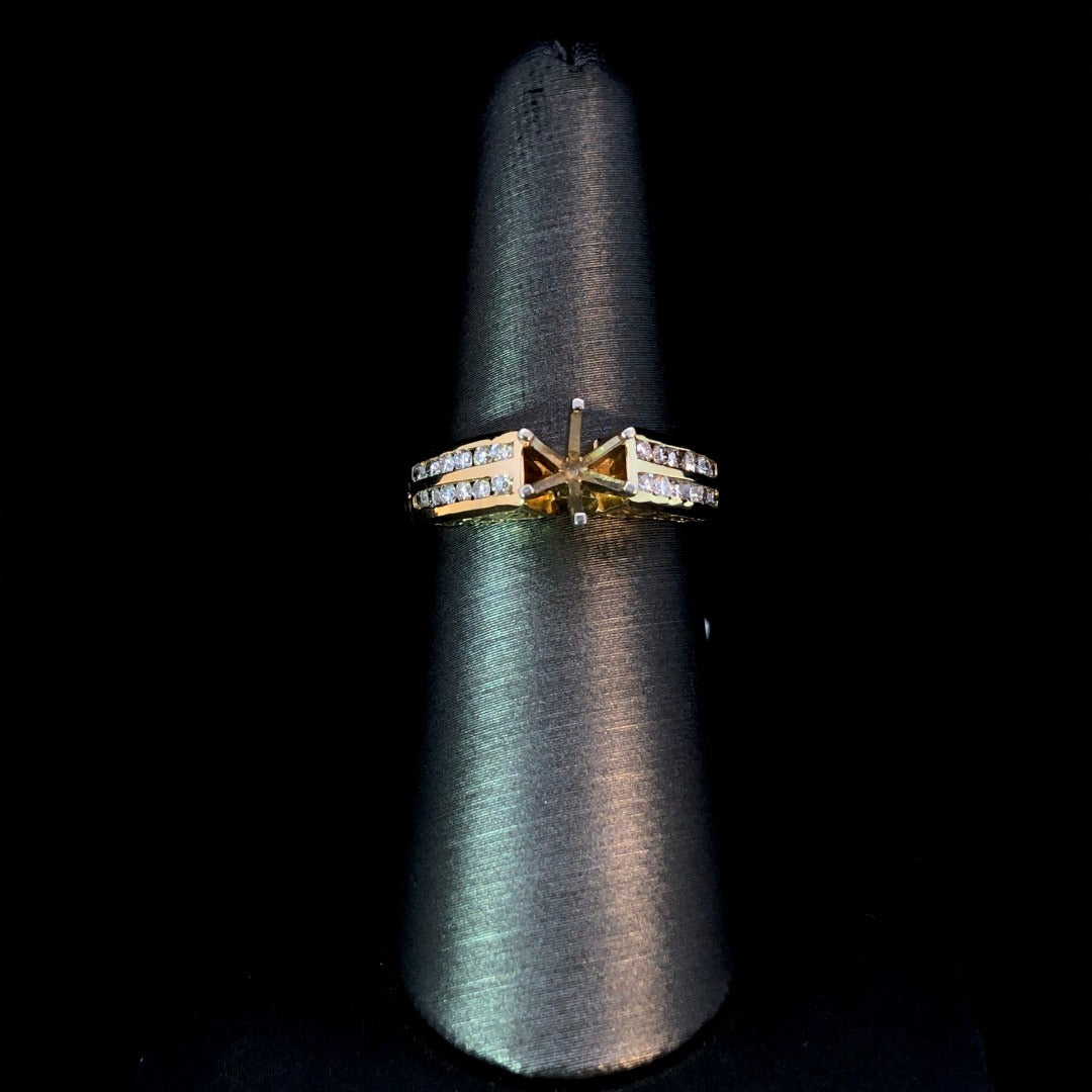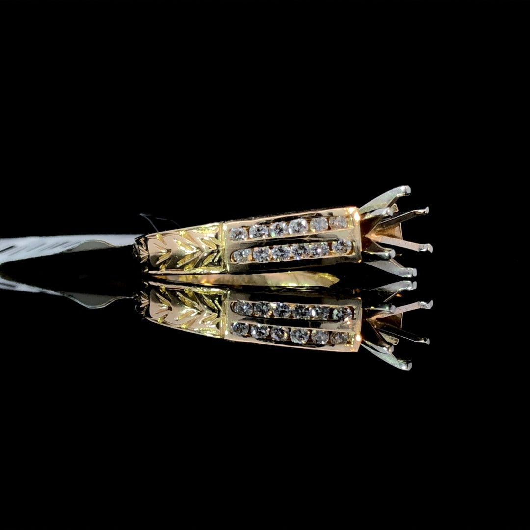 Elevate your style with our exquisitely crafted diamond semi mount. The intricate etching and double row of sparkling diamonds (totaling .44ctw) make this piece a true statement of luxury. Available in 14kt yellow gold, complete this masterpiece with your choice of center stone from our extensive selection. Price is for the semi mount only. Center stone will be added at an additional cost. This ring is a size 7. If that size is not a perfect fit, first time sizing is free at the time of purchase. Additional sizing fees may apply.