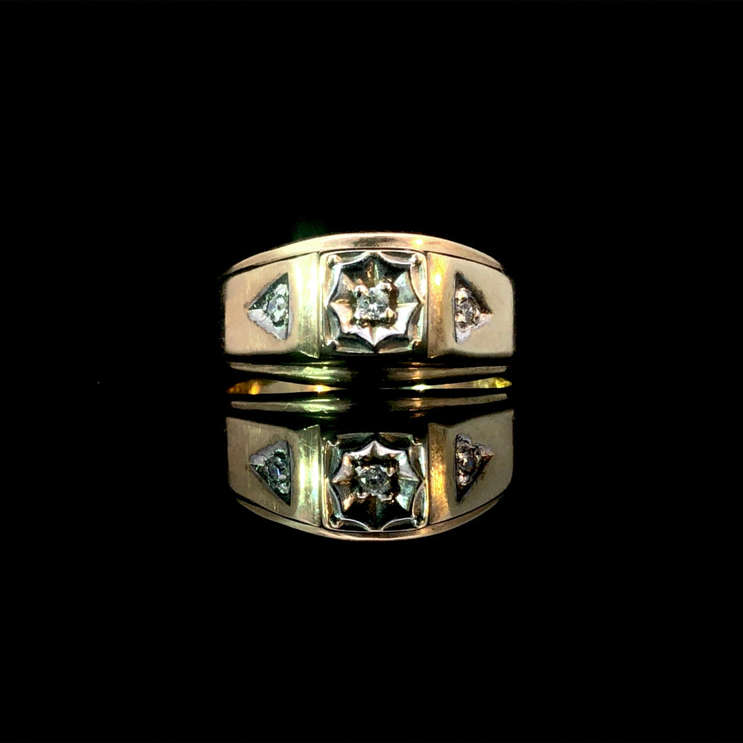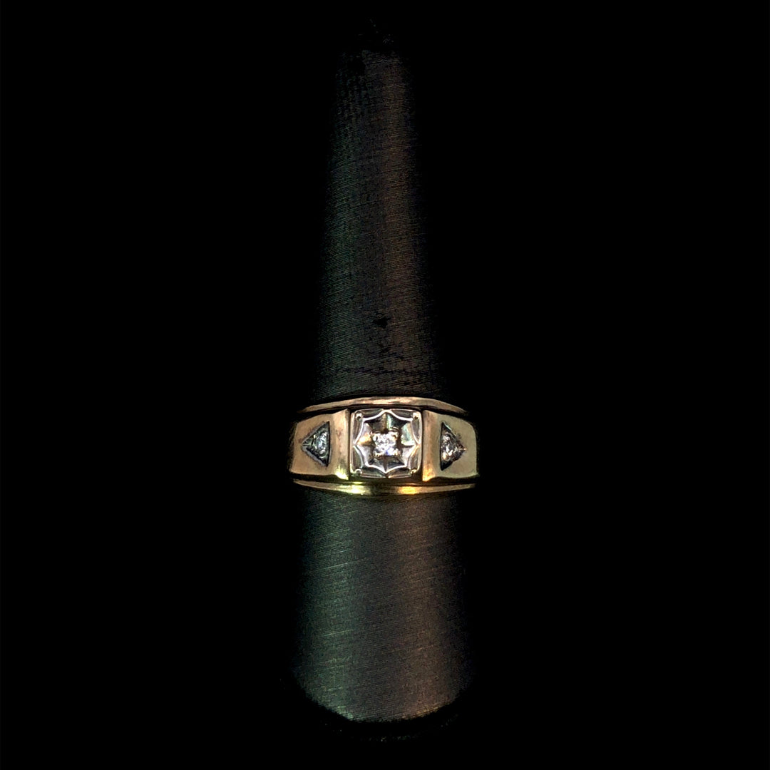 Crafted with 10kt yellow gold and .06ctw of round diamonds, this ring radiates sophistication. Add a touch of luxury to any outfit and make a lasting impression. Upgrade his look today. This ring is a size 9.5. If that size is not a perfect fit, first time sizing is free at the time of purchase. Additional sizing fees may apply.