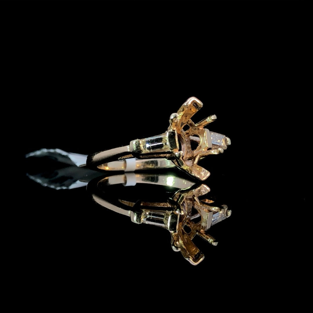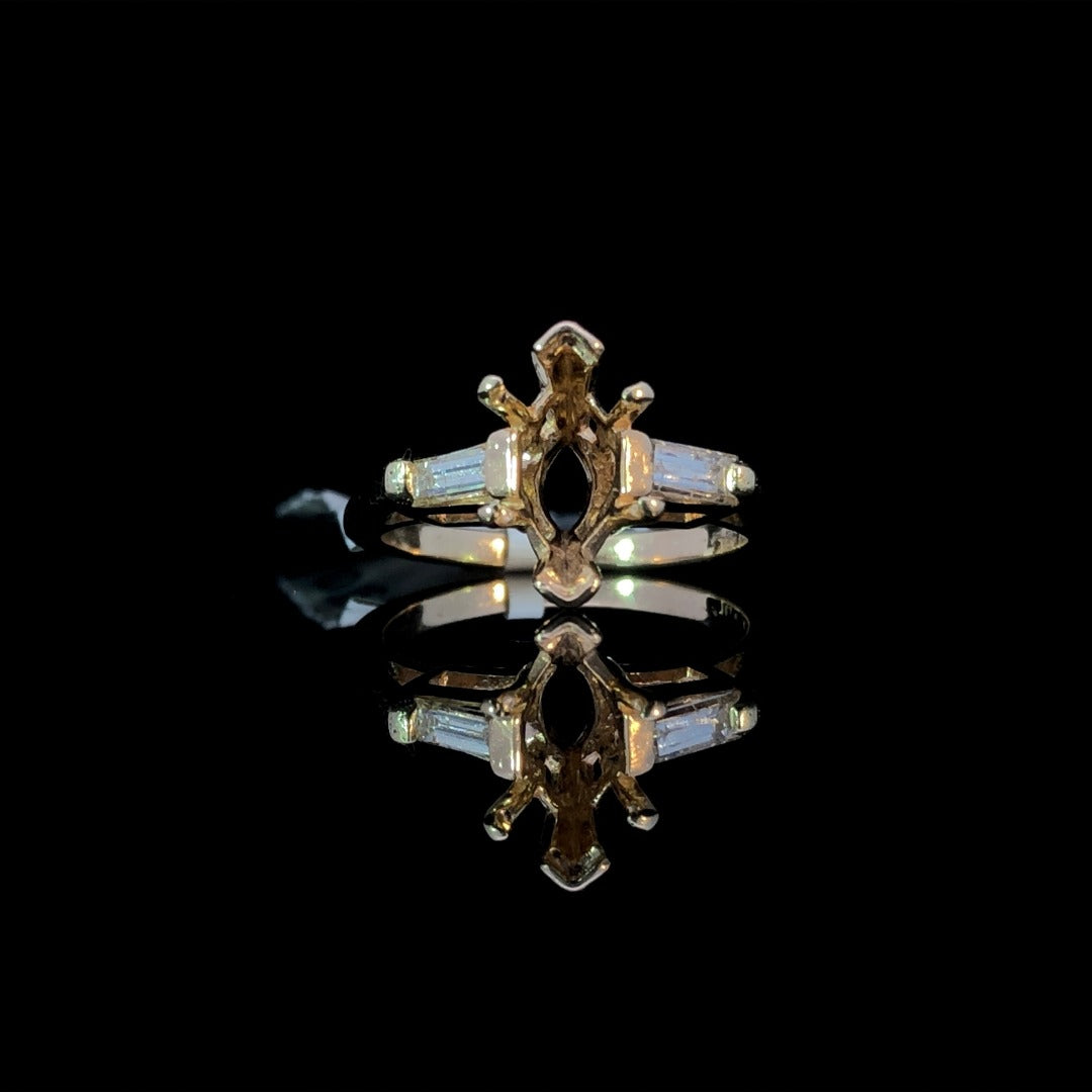 Indulge in timeless elegance with this classic diamond semi mount. Its warm yellow gold setting showcases 2 baguette diamond side stones totaling .30ctw, while the center stone of your choice from our wide selection of loose stones completes this luxurious piece. Create your own masterpiece today. Price is for the semi mount only. Center stone will be added at an additional cost. This ring is a size 7. If that size is not a perfect fit, first time sizing is free at the time of purchase. Additional sizing fees may apply.