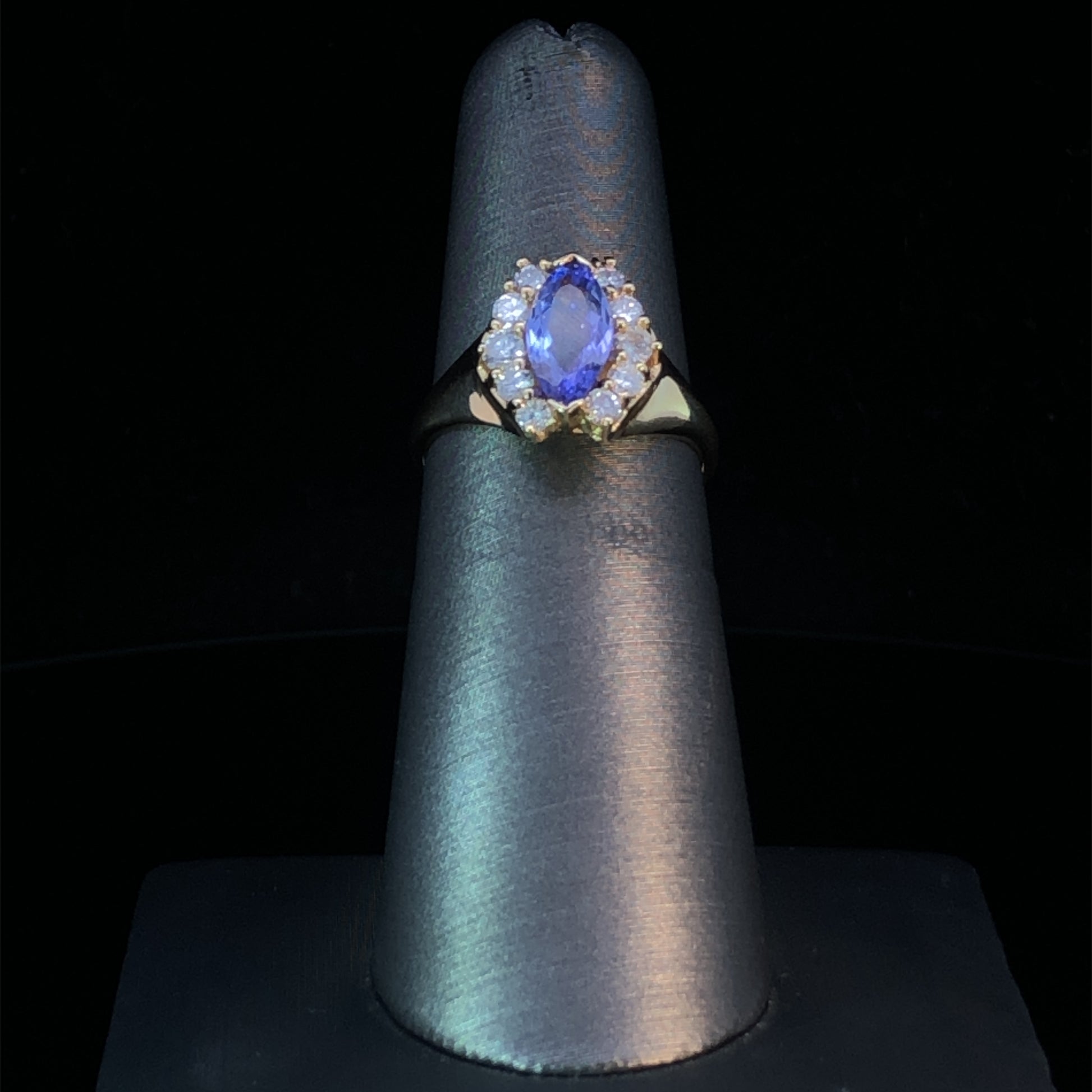 This exquisite 1.36ctw tanzanite and diamond ring is truly captivating. The center marquise cut tanzanite is set with a partial diamond halo to sparkle with maximum brilliance. Set in 14 kt yellow gold, this ring is sure to impress and excite! This ring is a size 7. If that size is not a perfect fit, first time sizing is free at the time of purchase. Additional sizing fees may apply.