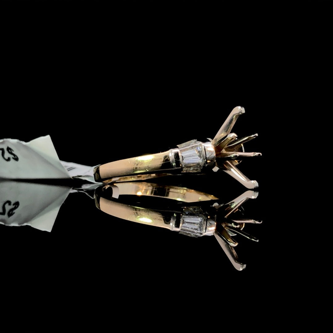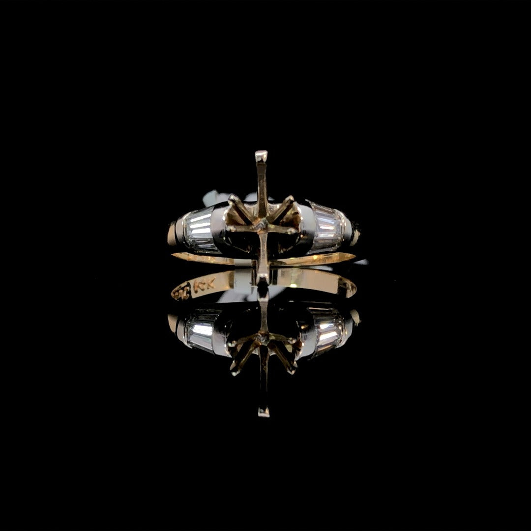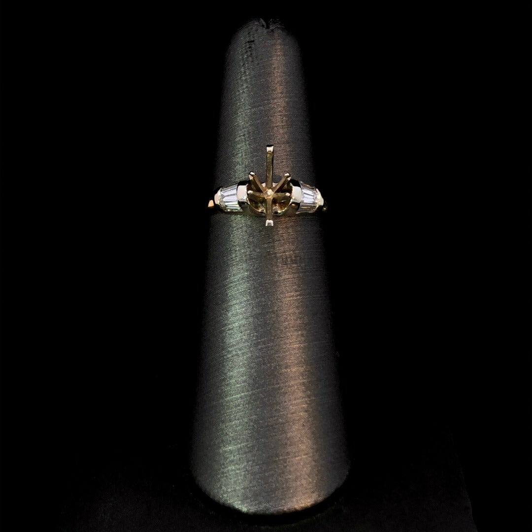 Embrace the timeless elegance of this timeless semi mount! Crafted with .39ctw of dazzling baguette side stones set in 14kt 2-tone gold, this ring is the perfect blank canvas for your choice of center stone. Choose from our wide selection of loose stones to create your own unique and stunning ring. Price is for the semi mount only. Center stone will be added at an additional cost. This ring is a size 7. If that size is not a perfect fit, first time sizing is free at the time of purchase. Additional sizing fees may apply. Additional sizing fees may apply.