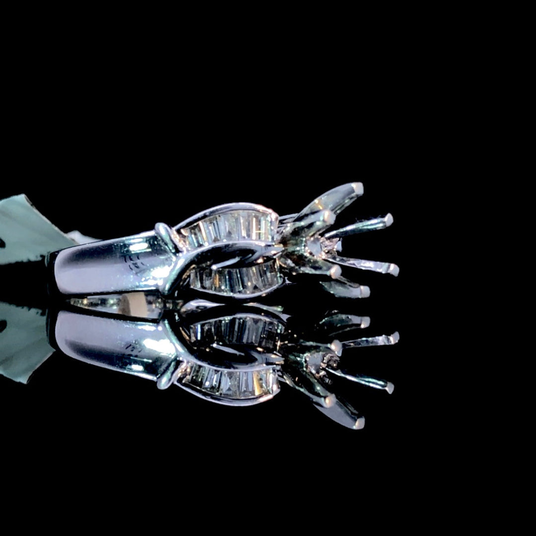 This exquisite platinum semi mount features .38ctw of elegant baguette diamonds arranged in a captivating twist pattern that frames your center stone beautifully. Design your own one-of-a-kind engagement ring by selecting from our curated collection of premium loose diamonds and gemstones. Each stone is hand-selected to ensure exceptional quality and brilliance, allowing you to create a truly personalized piece that reflects your unique style and vision. The sophisticated baguette accents add timeless glamour while the twist design brings contemporary flair to this classic setting. Price is for the semi mount only. Center stone will be added at an additional cost. This ring is a size 7. If that size is not a perfect fit, first time sizing is free at the time of purchase. Additional sizing fees may apply.