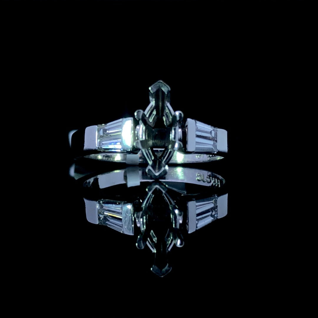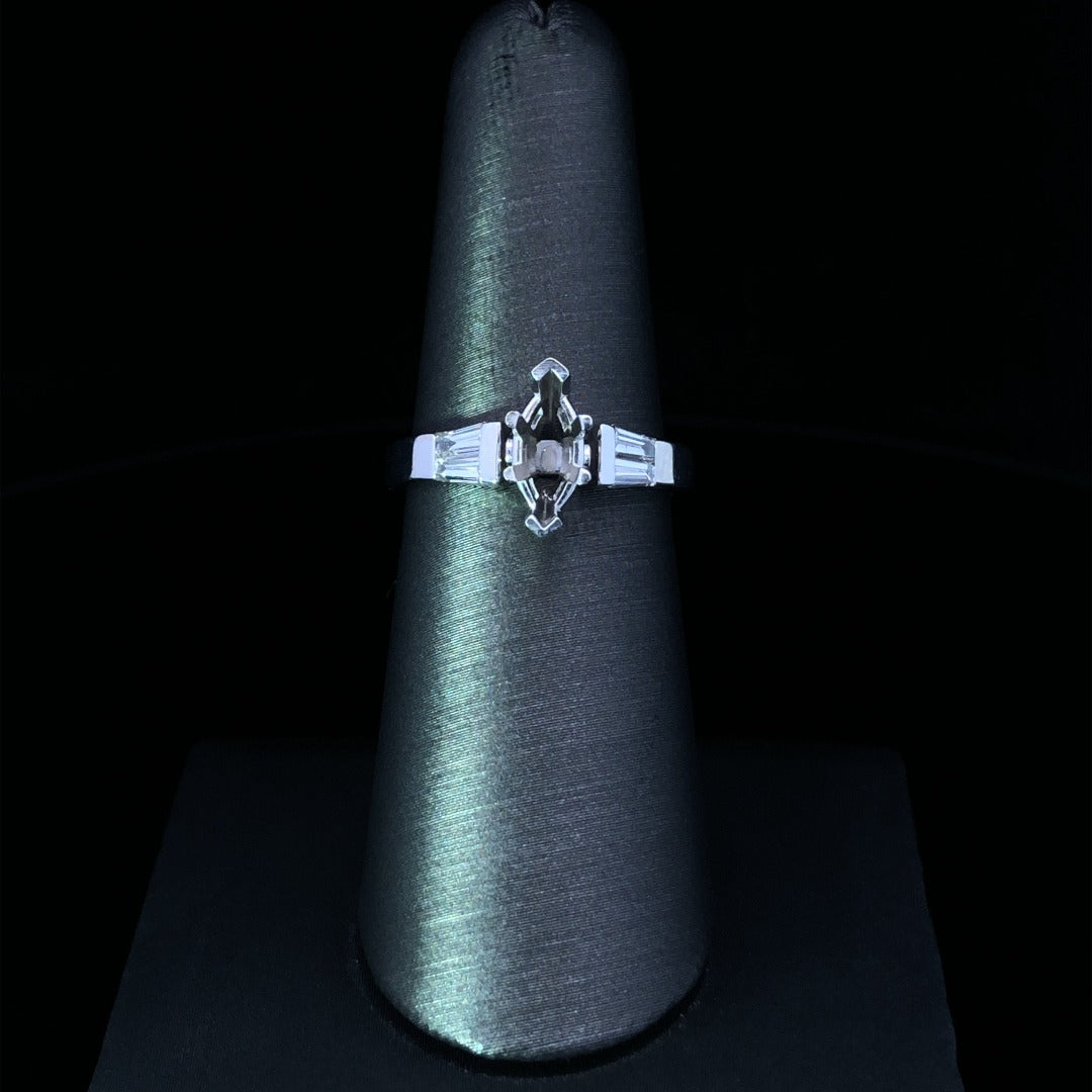 This elegantly crafted diamond semi mount will make a timelessly sophisticated statement. Made with a 14kt white gold setting, this piece is designed to hold the marquise stone of your choice, while .42 ctw of dazzling baguette side stones enhance its classic brilliance. Price is for semi mount only. Center stone will be added at an additional cost. This ring is a size 7. If that size is not a perfect fit, first time sizing is free at the time of purchase. Additional sizing fees may apply.