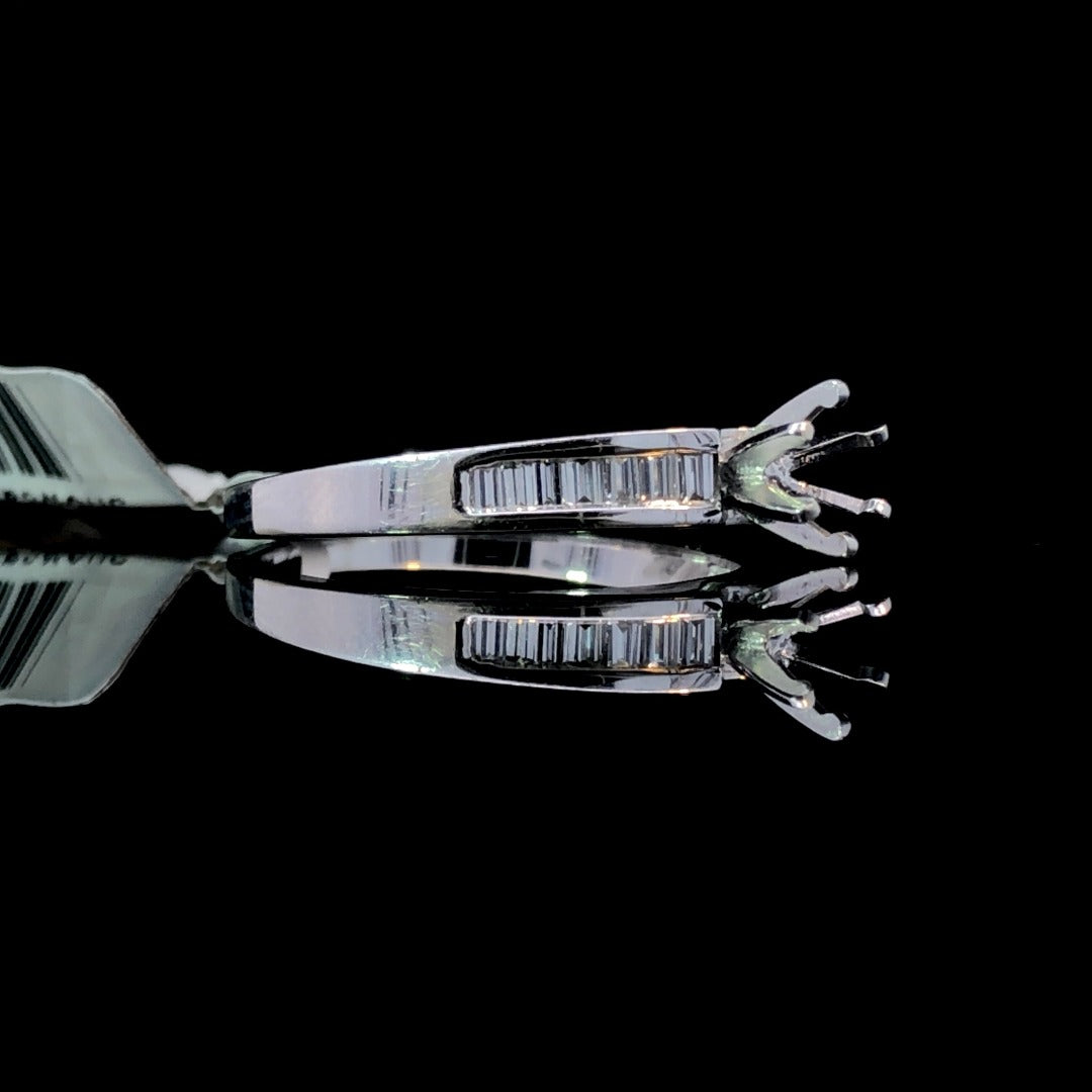 Experience timeless elegance with our gorgeous diamond semi mount. Featuring .28ctw of dazzling baguette diamonds set in 14kt white gold, this ring is the perfect canvas for your chosen center stone. Create a stunning, personalized piece from our unbeatable selection of loose stones. Price is for the semi mount only. Center stone will be added at an additional cost. This ring is a size 6.75. If that size is not a perfect fit, first time sizing is free at the time of purchase. Additional sizing fees may apply.