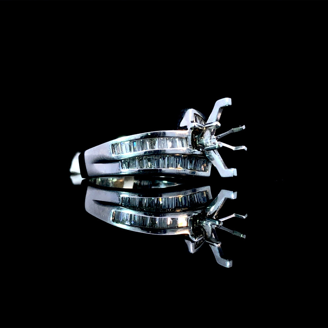 Discover the perfect foundation for your dream ring with this exquisite semi mount. Featuring 1.00 ctw of brilliant baguette diamonds elegantly channel set in luxurious platinum, this piece provides a sophisticated frame waiting for your ideal center stone. Browse our extensive collection of loose diamonds and gemstones to customize this stunning design into a truly one-of-a-kind treasure. Price is for the semi mount only. Center stone will be added at an additional cost. This ring is a size 7. If that size is not a perfect fit, first time sizing is free at the time of purchase. Additional sizing fees may apply.