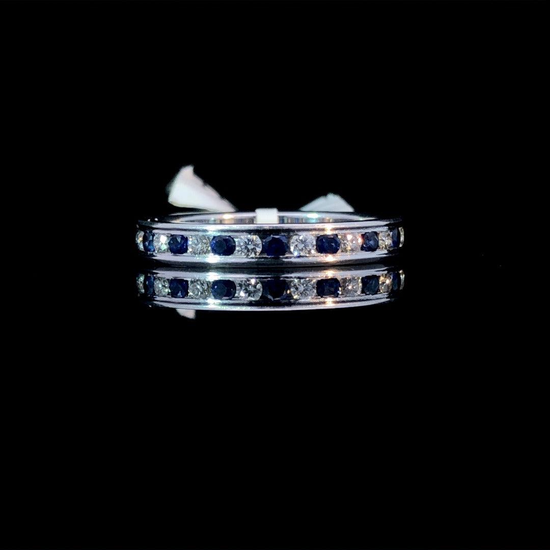 Enhance your collection with the vibrant and timeless design of this 14 kt white gold eternity band. Adorned with .68 ctw of dazzling round diamonds and sapphires, this band adds a unique touch to any ensemble. Channel set for secure and stylish wear. This ring is a size 6.