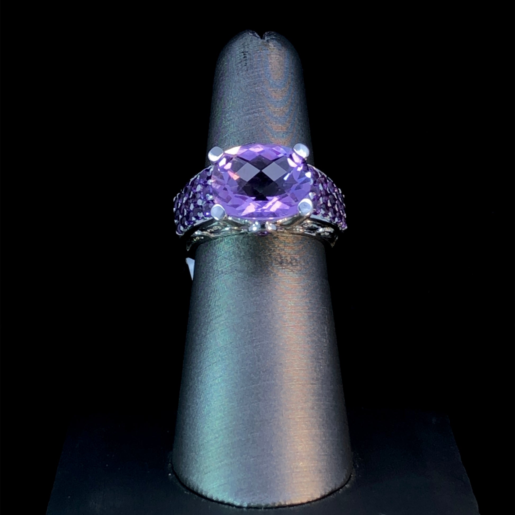 This exquisite gemstone ring presents a stunning arrangement of deep purple amethysts. A 5.00ct stone takes the spotlight in the center, flanked by .88ctw of amethyst side stones and .09ctw of dazzling diamond accents underneath. A perfect piece of luxury jewelry to add a touch of elegance to any outfit. This ring is a size 7. If that size is not a perfect fit, first time sizing is free at the time of purchase. Additional sizing fees may apply.