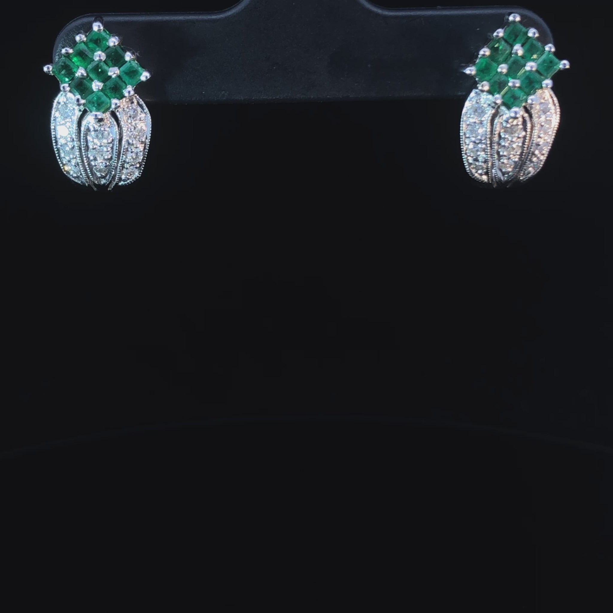 Gorgeous and timeless, these 14 Kt white gold earrings glimmer with .30 ctw of diamonds and .78 ctw of emeralds. Make every occasion sparkle with these exquisite earrings that add an elegant touch to any outfit. Dare to be magnificent.