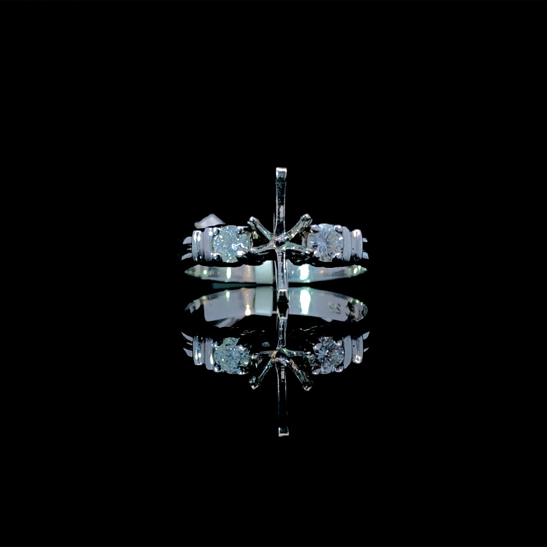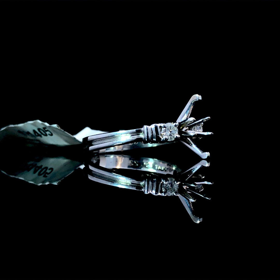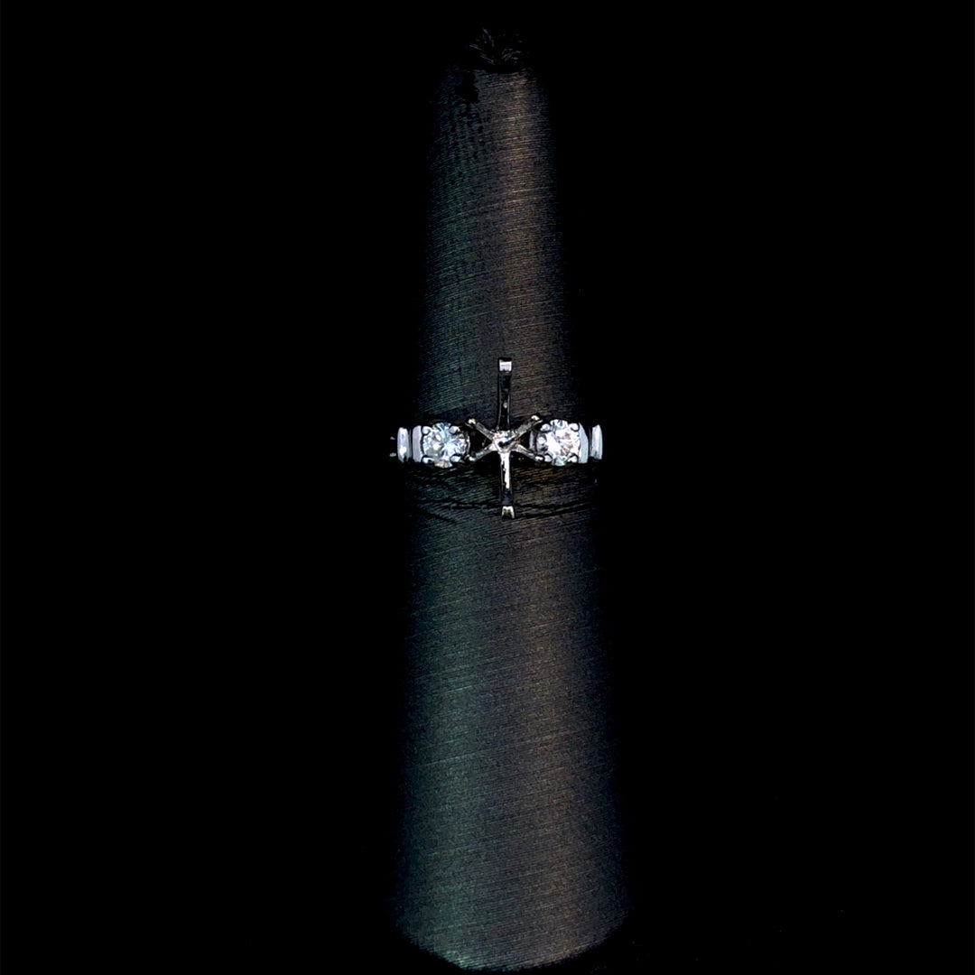 This elegant platinum semi mount showcases two brilliant round diamond side stones totaling .24ctw, creating a sophisticated frame for your chosen center stone. Select from our curated collection of loose diamonds to personalize this timeless design and create a ring that's uniquely yours. A versatile foundation for the engagement ring of your dreams. Price is for the semi mount only. Center stone will be added at an additional cost. This ring is a size 6. If that size is not a perfect fit, first time sizing is free at the time of purchase. Additional sizing fees may apply.