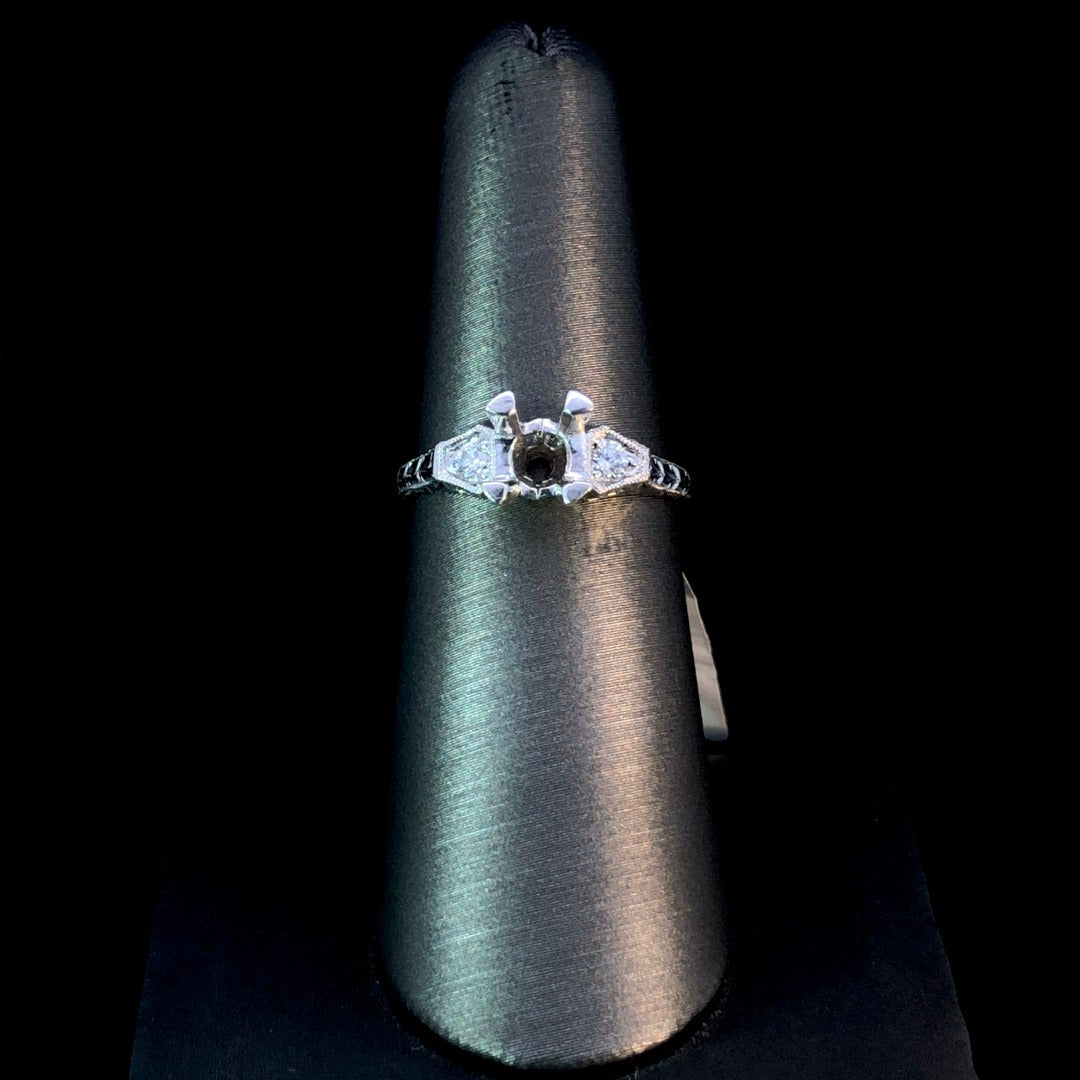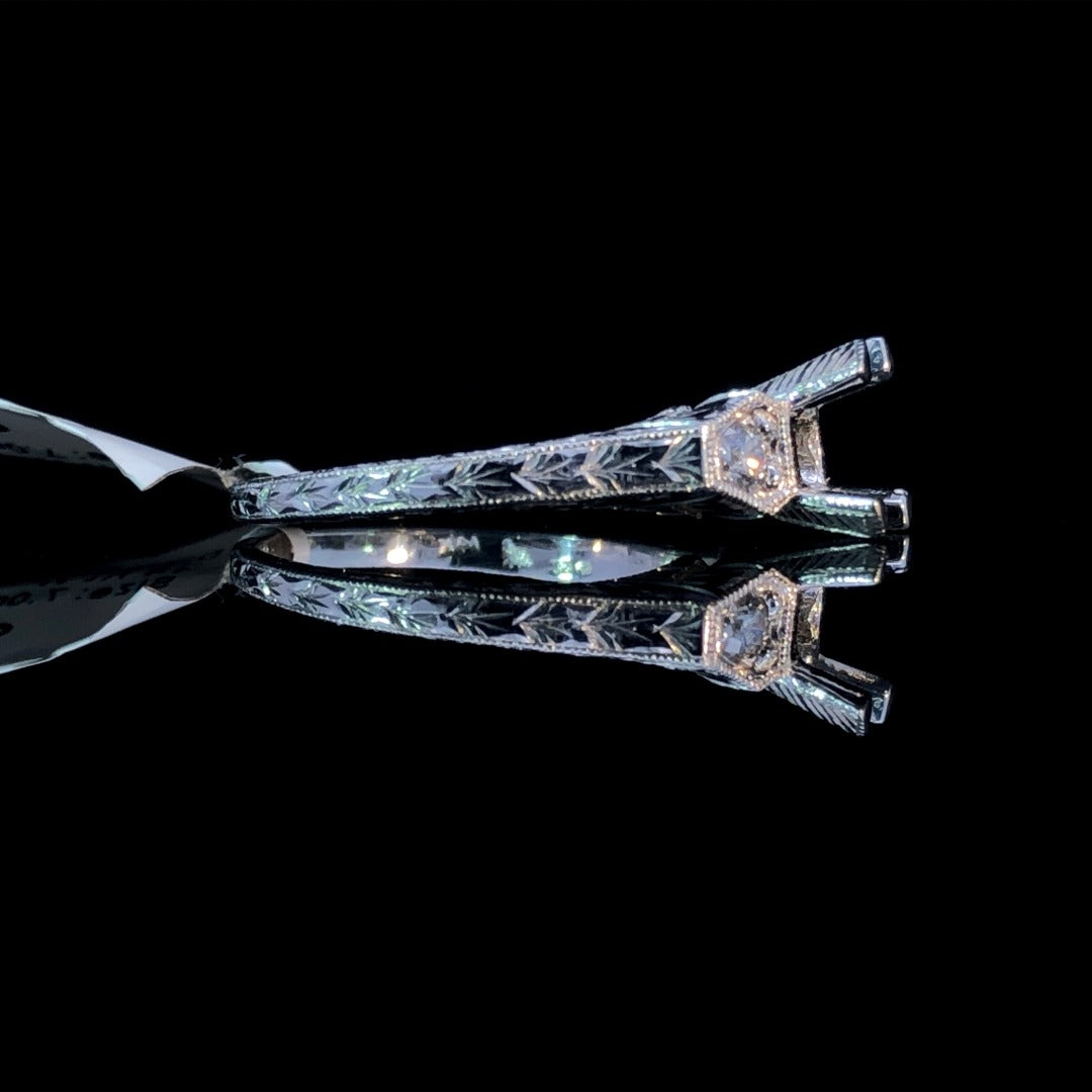 This 14kt white gold semi mounting is perfect for adding some sparkle to your jewelry wardrobe. With its .13ctw of round diamond accents in an antique style design, it is sure to turn heads. Complete the piece with your choice of center diamond and make any occasion unforgettable! Price is for the semi mount only. Center stone will be added at an additional cost. This ring is a size 7. If that size is not a perfect fit, first time sizing is free at the time of purchase. Additional sizing fees may apply.