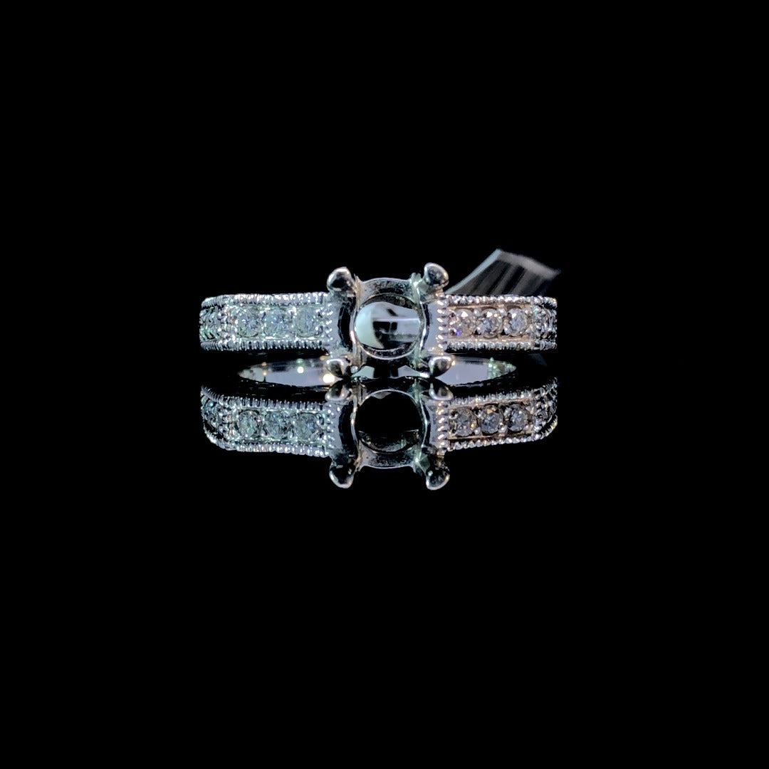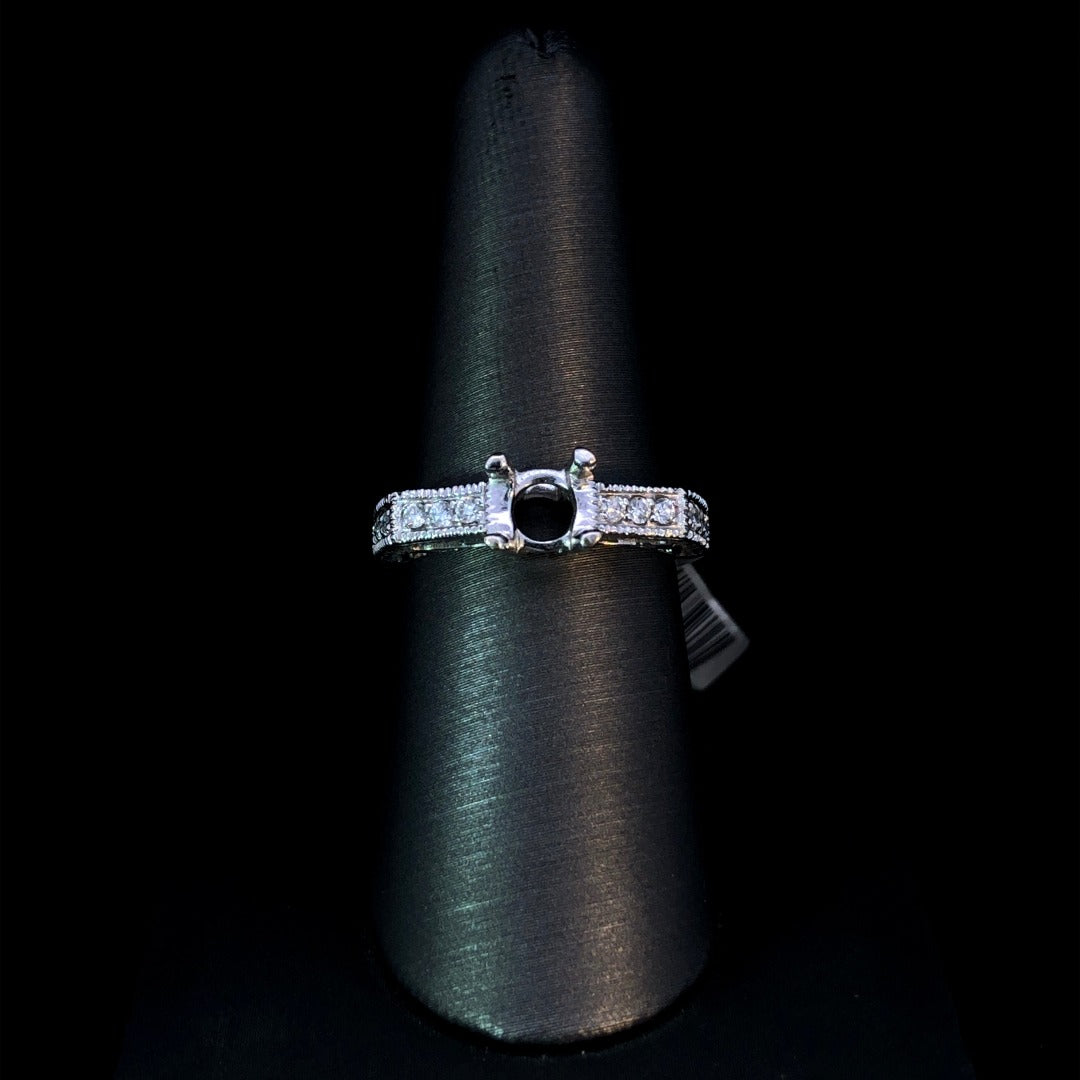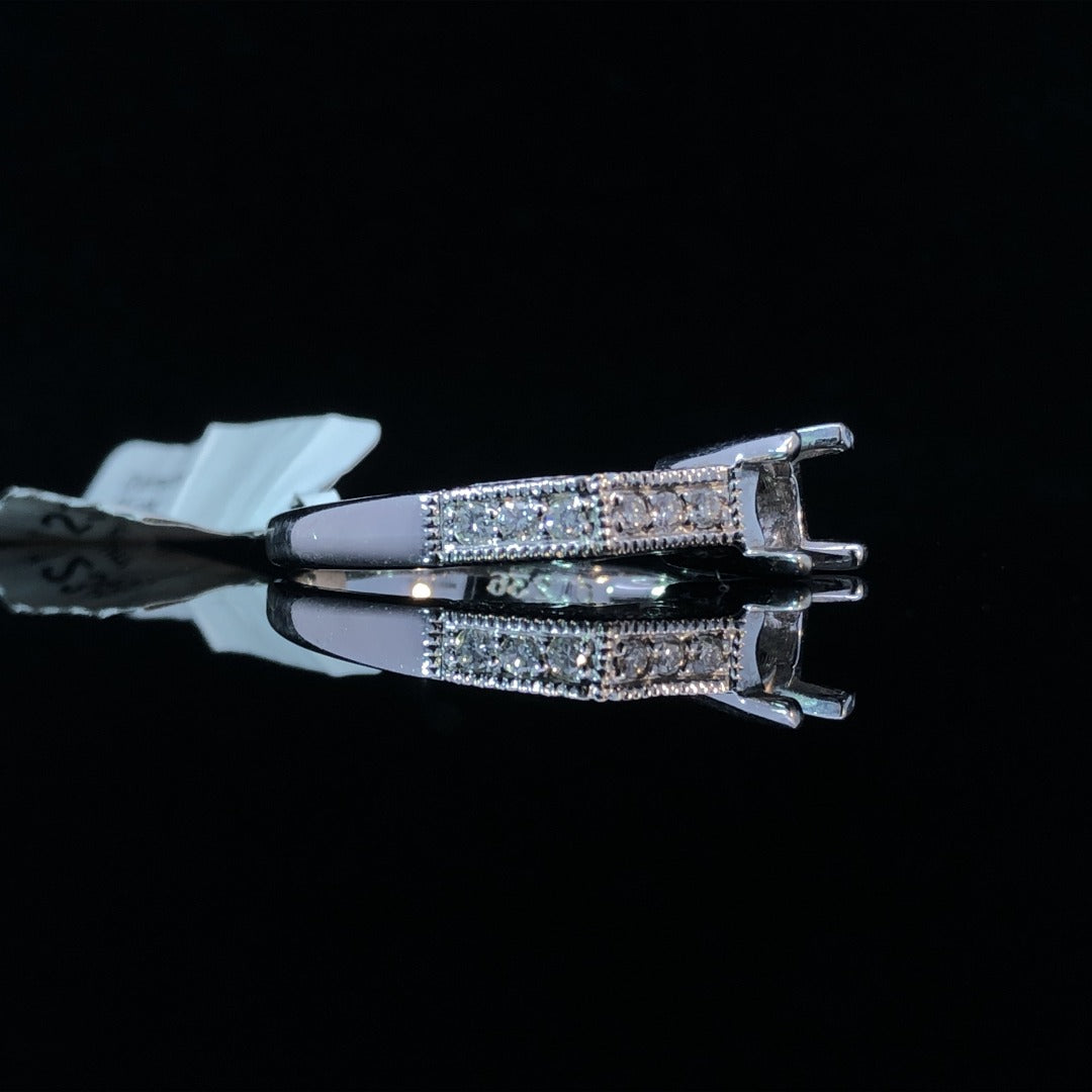 Elevate your jewelry collection with this beautiful diamond semi mount. Showcasing a unique cut corner design, with .23ctw of sparkling round diamonds, delicate filigree and milgrain details, this ring exudes elegance and charm. Customize it with your choice of center stone from our stunning collection of loose diamonds for a truly one-of-a-kind look. Price is for the semi mount only. Center stone will be added at an additional cost. This ring is a size 7. If that size is not a perfect fit, first time sizing is free at the time of purchase. Additional sizing fees may apply.