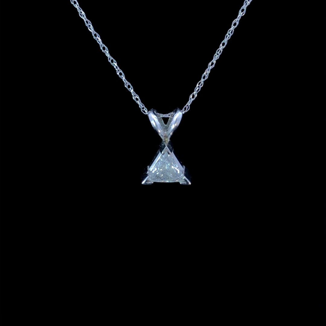 This stunning solitaire pendant will turn heads! Crafted in 14k white gold, its .49ct trillion cut diamond is sure to make a dazzling statement. This elegant piece will add a touch of class to any outfit. Chain is not included.