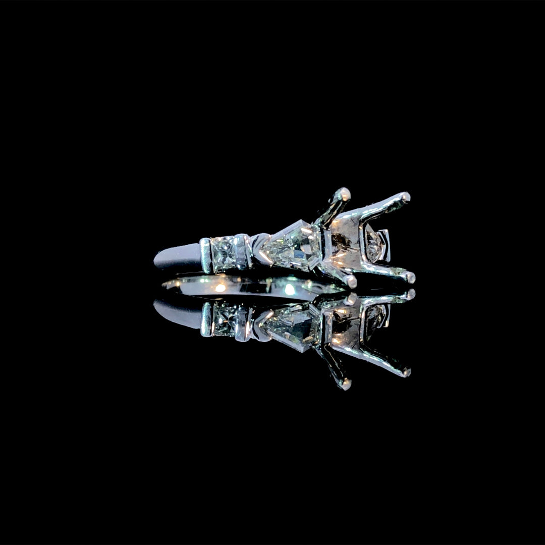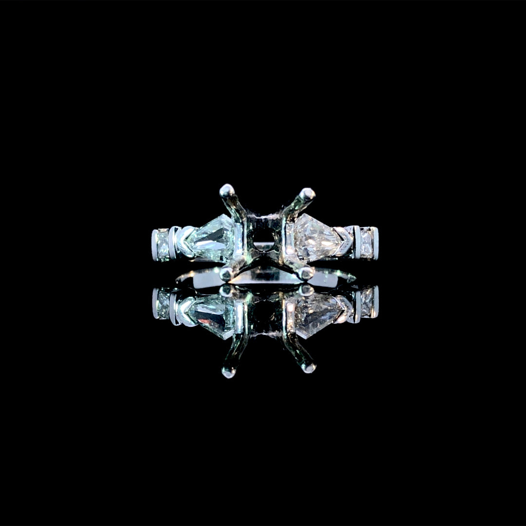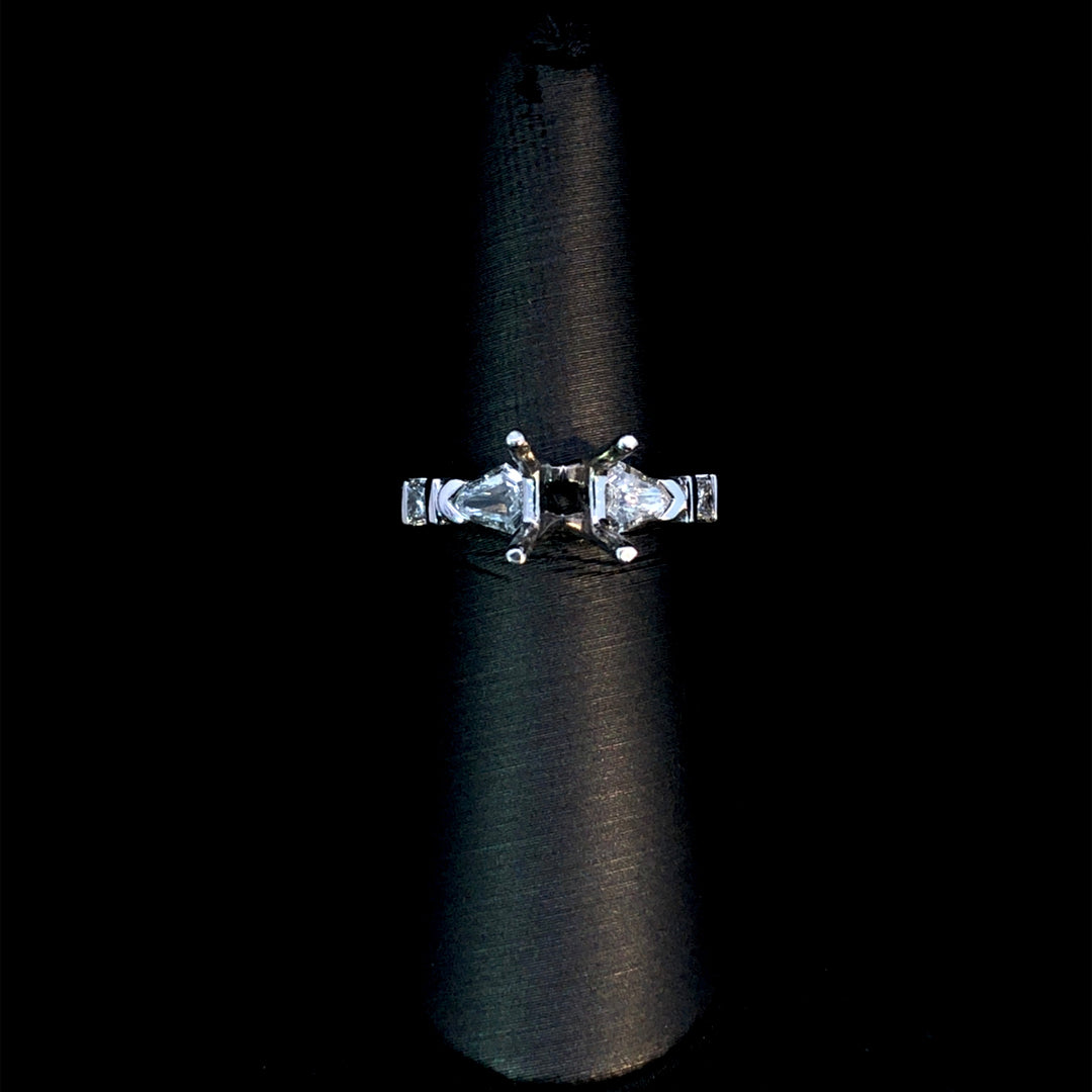 This exquisite semi mount offers the perfect foundation for your dream ring. Featuring .56 ctw of sparkling diamond accents beautifully set in luxurious platinum, it's designed to showcase your choice of center stone. Select from our curated collection of loose stones to create a truly personalized and breathtaking piece that reflects your unique style and vision. Price is for the semi mount only. Center stone will be added at an additional cost. This ring is a size 7. If that size is not a perfect fit, first time sizing is free at the time of purchase. Additional sizing fees may apply.