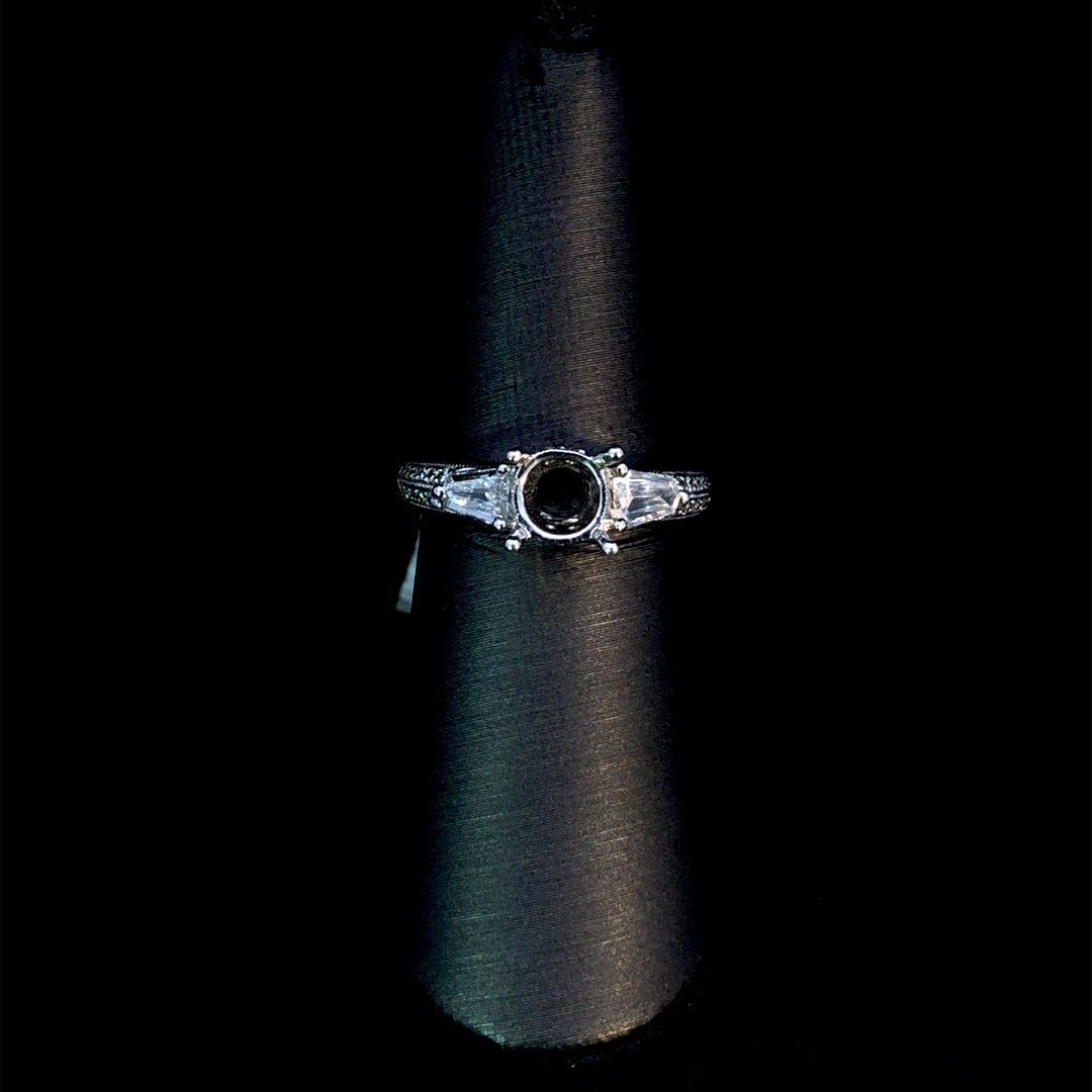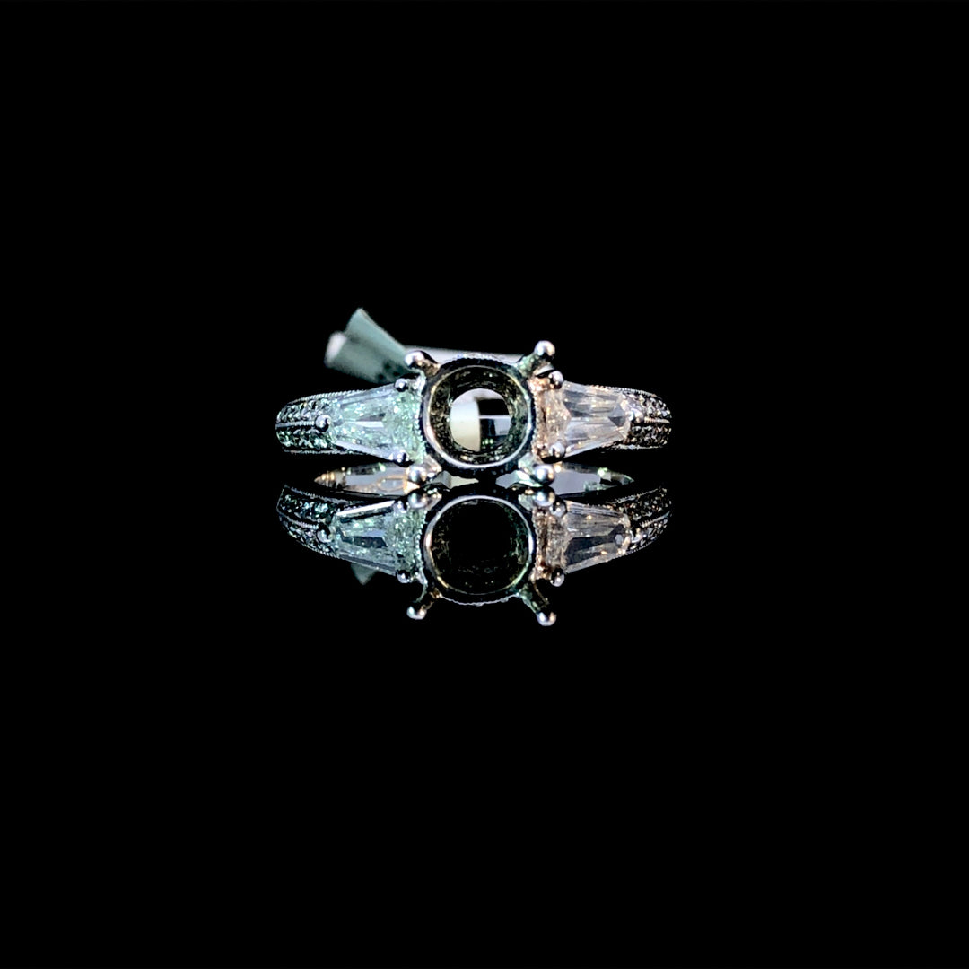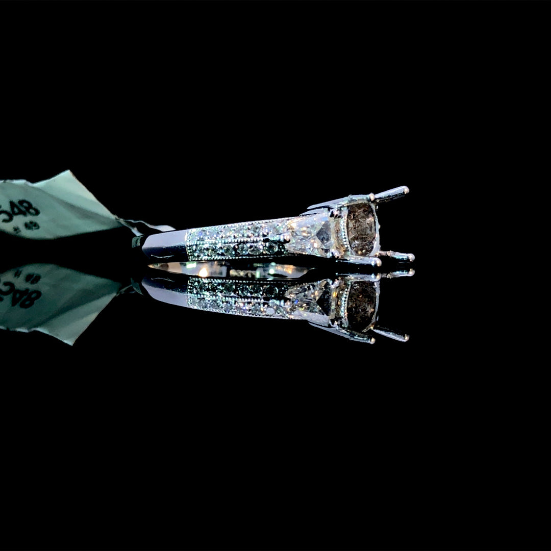 Elevate your love story with this exquisite platinum semi mount, designed to showcase your perfect center stone. Two distinctive diamond side stones frame your chosen stone, while a double row of round diamonds adorns the band in sophisticated elegance. With .53ctw of premium diamonds already set, this semi mount provides the ideal foundation for a truly personalized engagement ring that reflects your unique style and vision. Price is for the semi mount only. Center stone will be added at an additional cost. This ring is a size 7. If that size is not a perfect fit, first time sizing is free at the time of purchase. Additional sizing fees may apply.