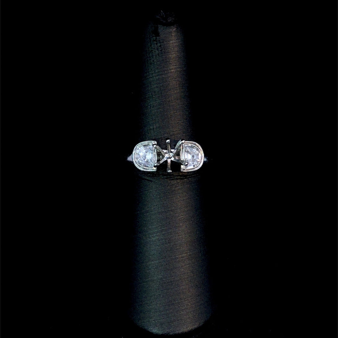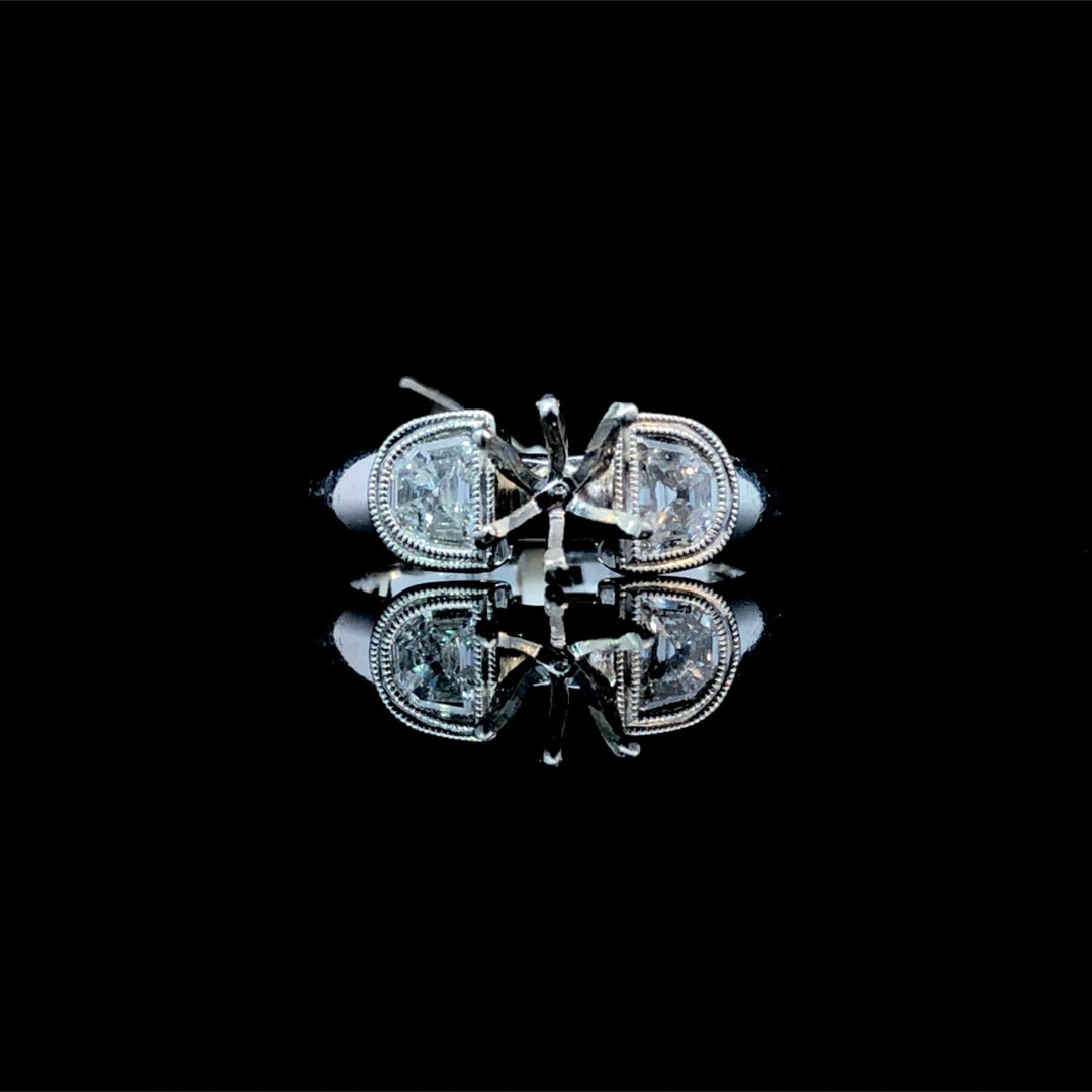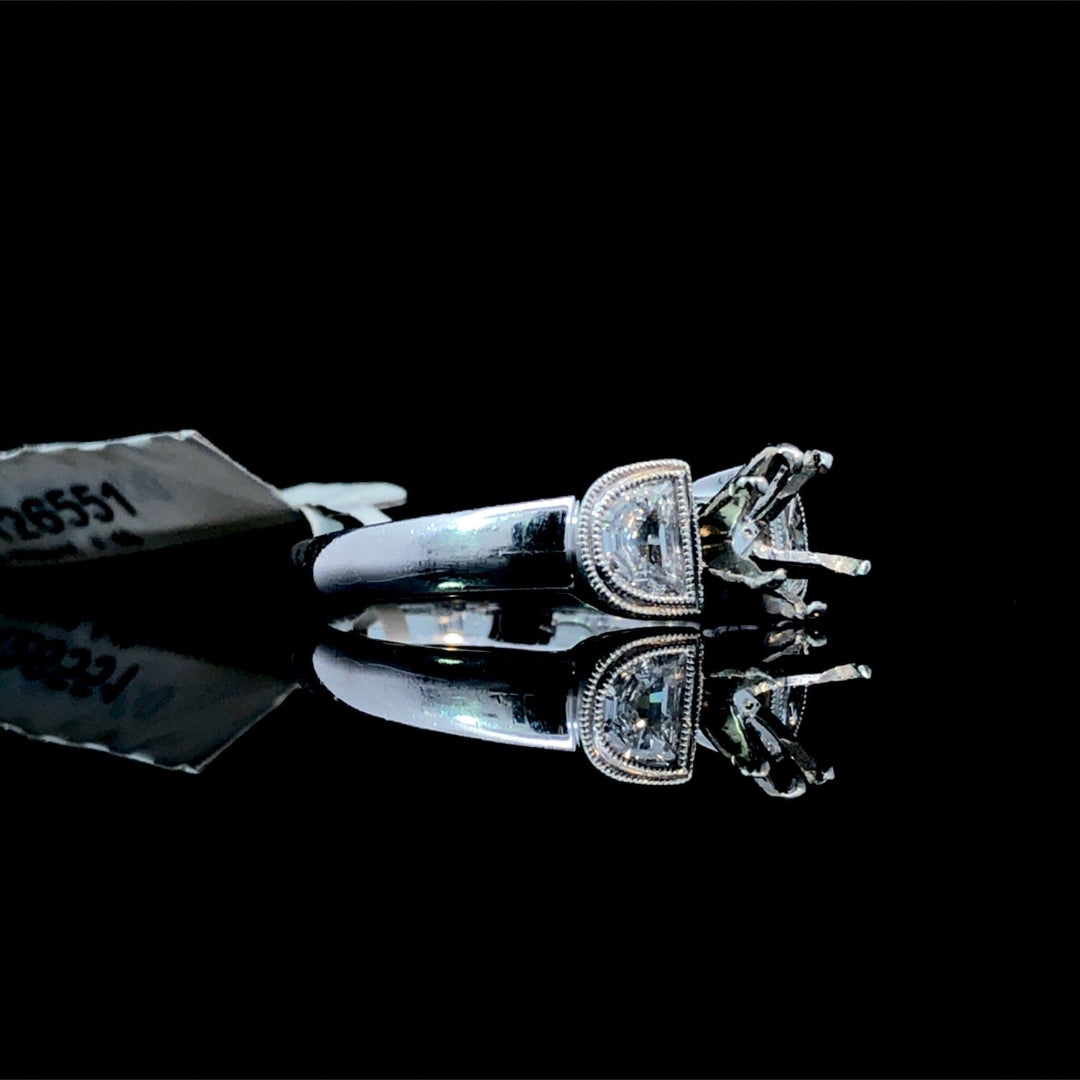 Create your dream engagement ring with this elegant platinum semi mount. Featuring two captivating half-moon diamonds secured in bezel settings with refined milgrain accents, this foundation delivers .40ctw of brilliance before you add your center stone. Browse our exceptional collection of loose diamonds and gemstones to customize every detail, crafting a meaningful piece that's authentically yours and celebrates your individual love story. Price is for the semi mount only. Center stone will be added at an additional cost. This ring is a size 7. If that size is not a perfect fit, first time sizing is free at the time of purchase. Additional sizing fees may apply.