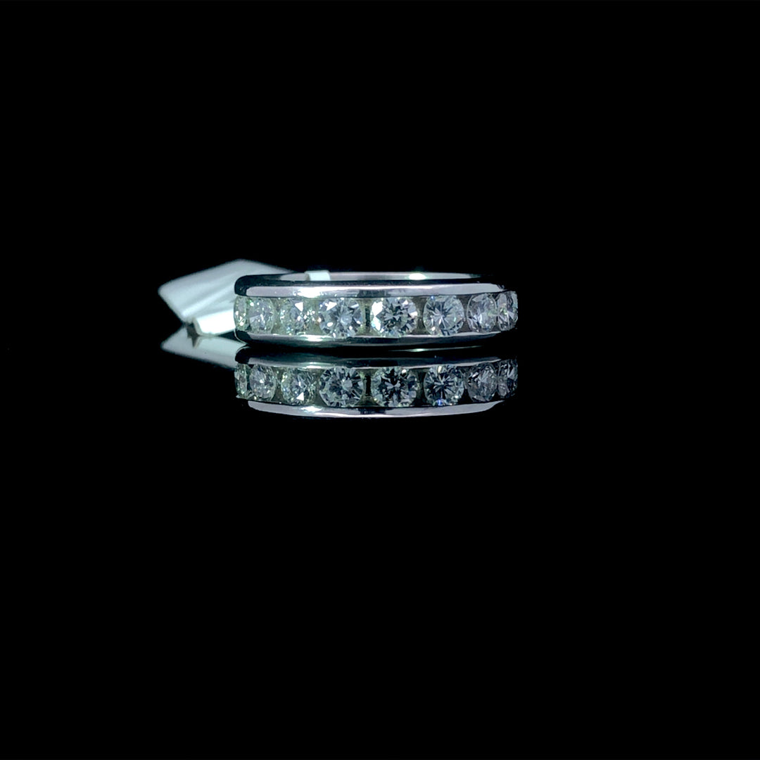 Upgrade your jewelry collection with this elegant diamond band. Featuring a timeless design, this band boasts 1.00ctw of round diamonds channel set in platinum. Make a statement with this stunning piece that exudes luxury and sophistication. This ring is a size 6. If that size is not a perfect fit, first time sizing is free at the time of purchase. Additional sizing fees may apply.