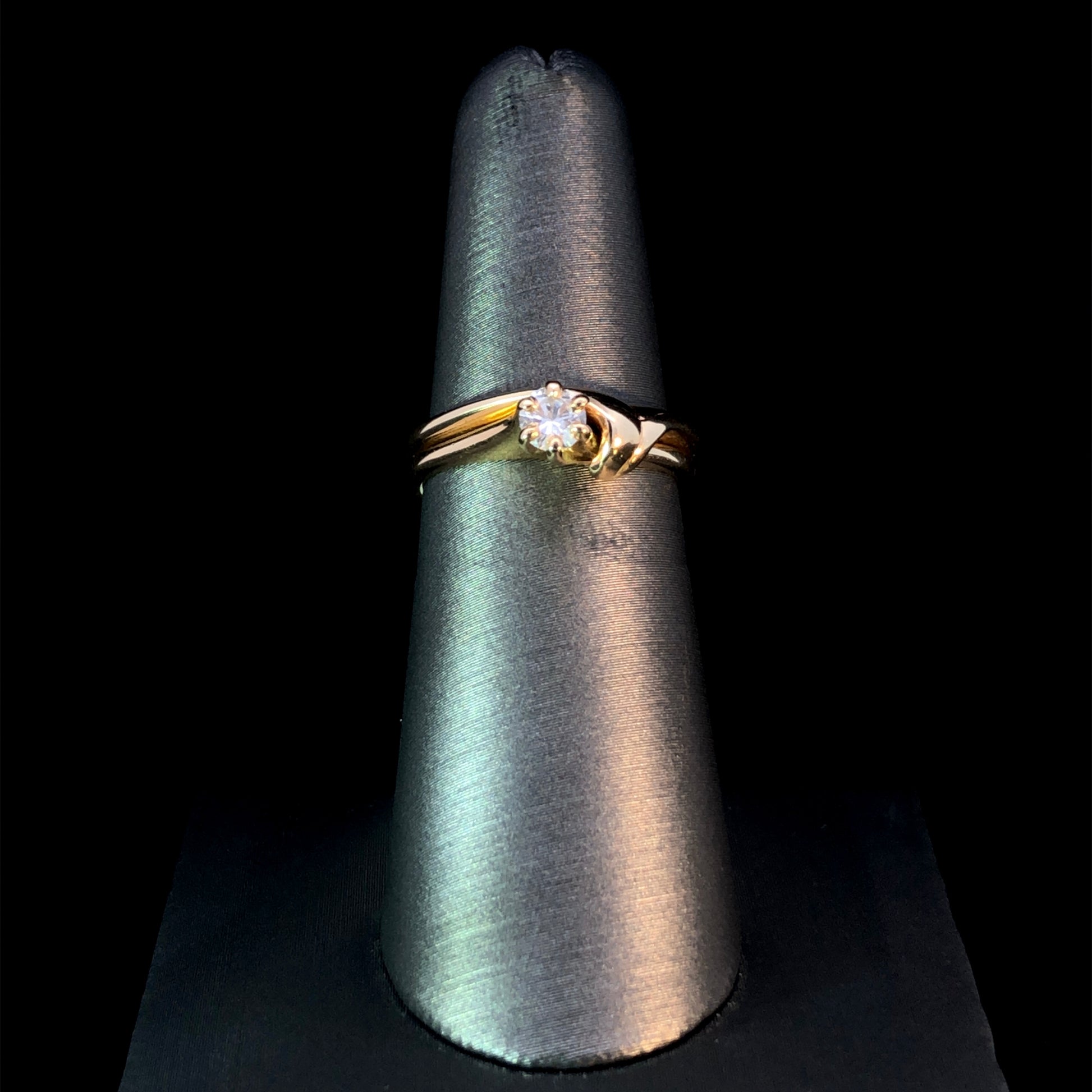 This elegant 14kt yellow gold ring is a timeless choice for your special moment. A .24ct round diamond shimmers in a classic solitaire setting, paired with a gracefully curved wrap-style band crafted to fit perfectly around the center stone. Make a lasting statement with this timeless and beautiful piece. This set is a size 6. If that size is not a perfect fit, first time sizing is free at the time of purchase. Additional sizing fees may apply.