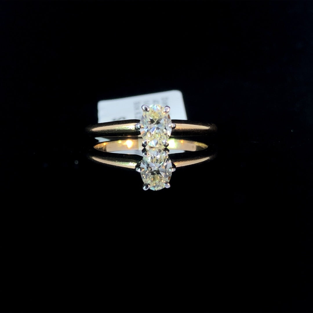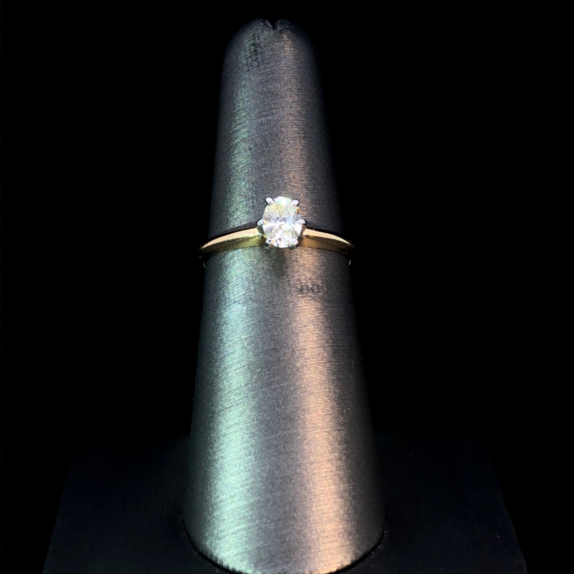 This classic diamond solitaire ring features a 0.43 carat oval diamond set in a white gold head and a 14kt yellow gold band, creating a timeless look for any occasion. The oval diamond enhances brilliance and sparkle, making this an ideal choice for those looking for an eye-catching piece that will never go out of style. This ring is a size 6.25. If that size is not a perfect fit, first time sizing is free at the time of purchase.