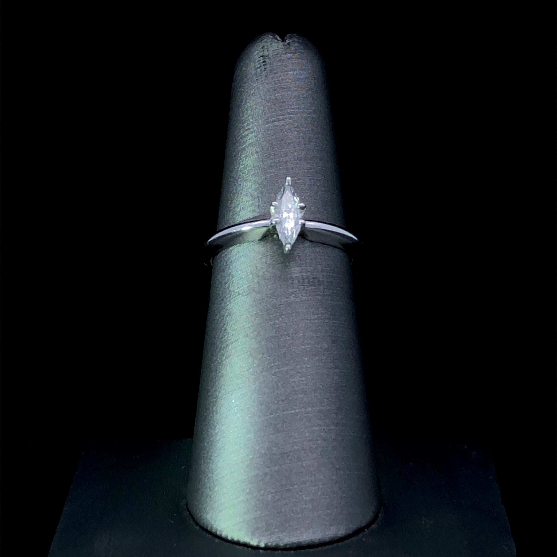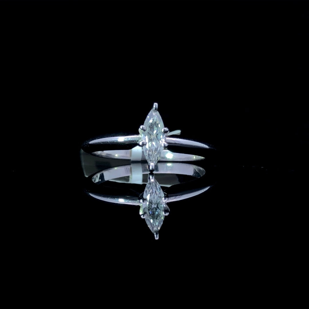 Be captivated by this timeless diamond solitaire, crafted with a .43ct marquise cut diamond set in a luxurious 14kt white gold setting. This classic piece exudes effortless elegance, perfect for those with an eye for detail and an appreciation for exquisite craftsmanship. This ring is a size 6. If that size is not a perfect fit, first time sizing is free at the time of purchase. Additional sizing fees may apply.