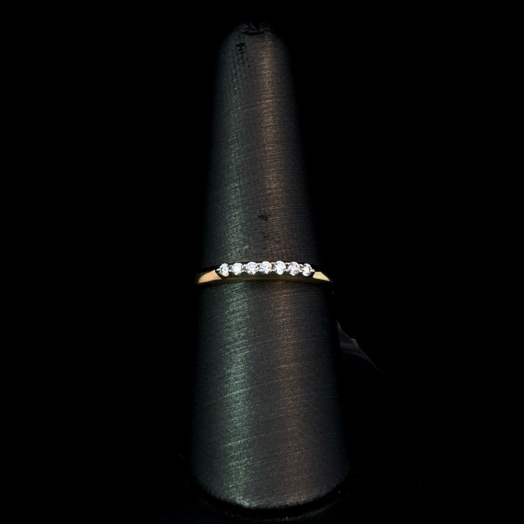 Elevate your style with our classic diamond band. Crafted with a delicate 14kt yellow gold band, this ring features .15ctw of stunning round diamonds. A timeless choice that exudes luxury and elegance. Complete your look with this sophisticated piece. This ring is a size 7. If that size is not a perfect fit, first time sizing is free at the time of purchase. Additional sizing fees may apply.