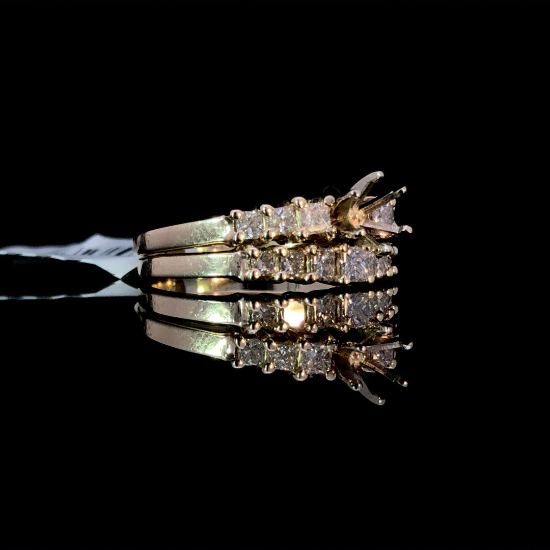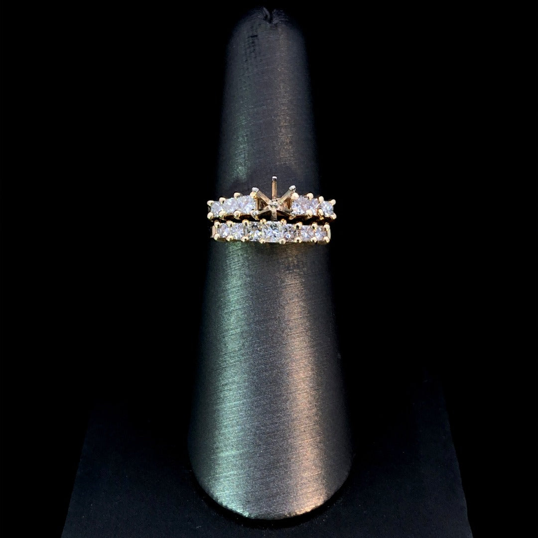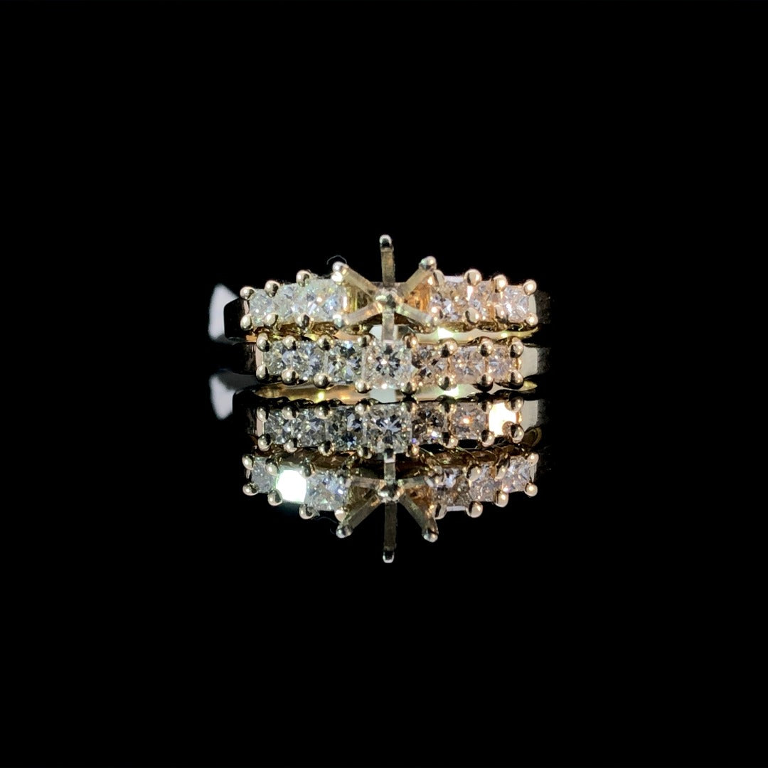 Find your forever with this stunning piece! This exquisite set features .80ctw of sparkling princess cut diamonds, set in 14kt yellow gold. Personalize with your choice of center stone and custom sizing usually within the day. Price is for the semi and band only. Center stone will be added at an additional cost. This ring is a size 7. If that size is not a perfect fit, firs time sizing is free at the time of purchase. Additional sizing fees may apply.