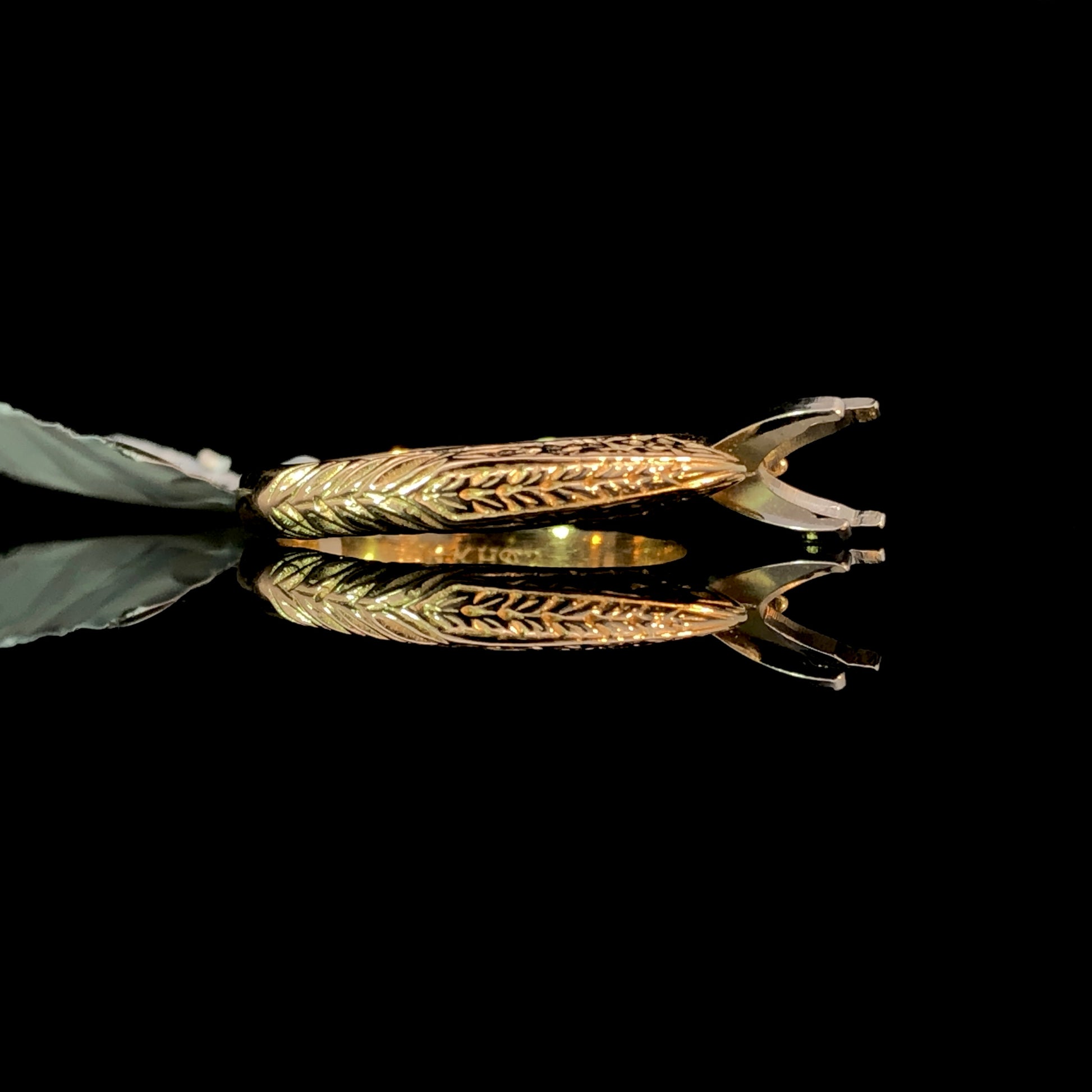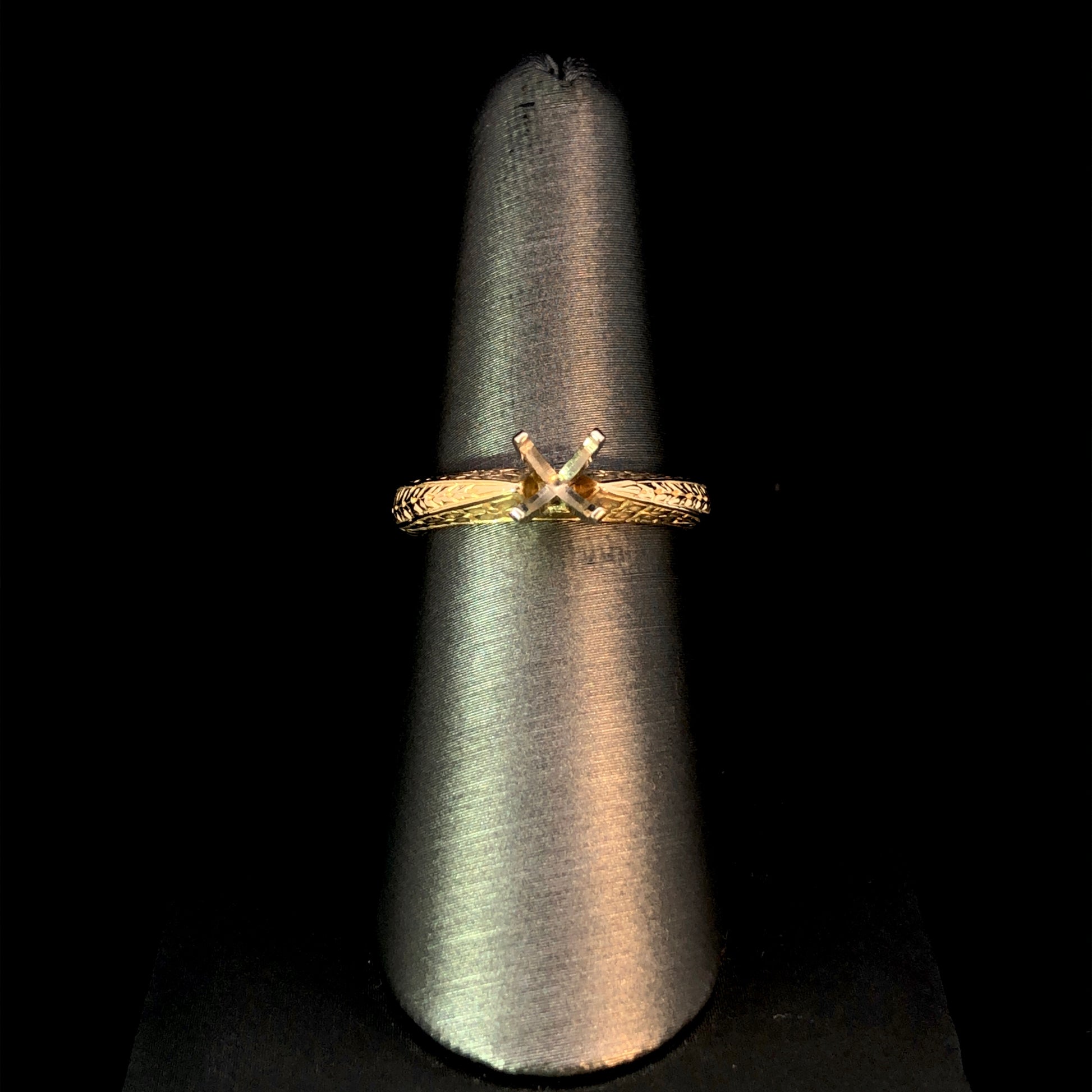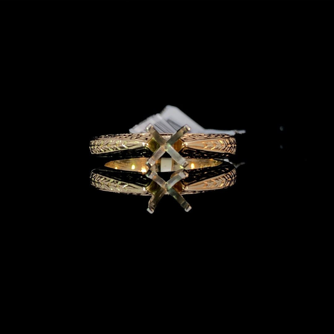 This stunning 14kt yellow gold semi mount boasts intricate etching designs, offering a luxurious and exclusive touch to any outfit. Choose from our wide selection of loose stones to create a truly unique and elegant piece. Elevate your style with this gorgeous semi mount. Price is for the semi mount only. Center stone will be added at an additional cost. This ring is a size 6. If that size is not a perfect fit, first time sizing is free at the time of purchase. Additional sizing fees may apply.