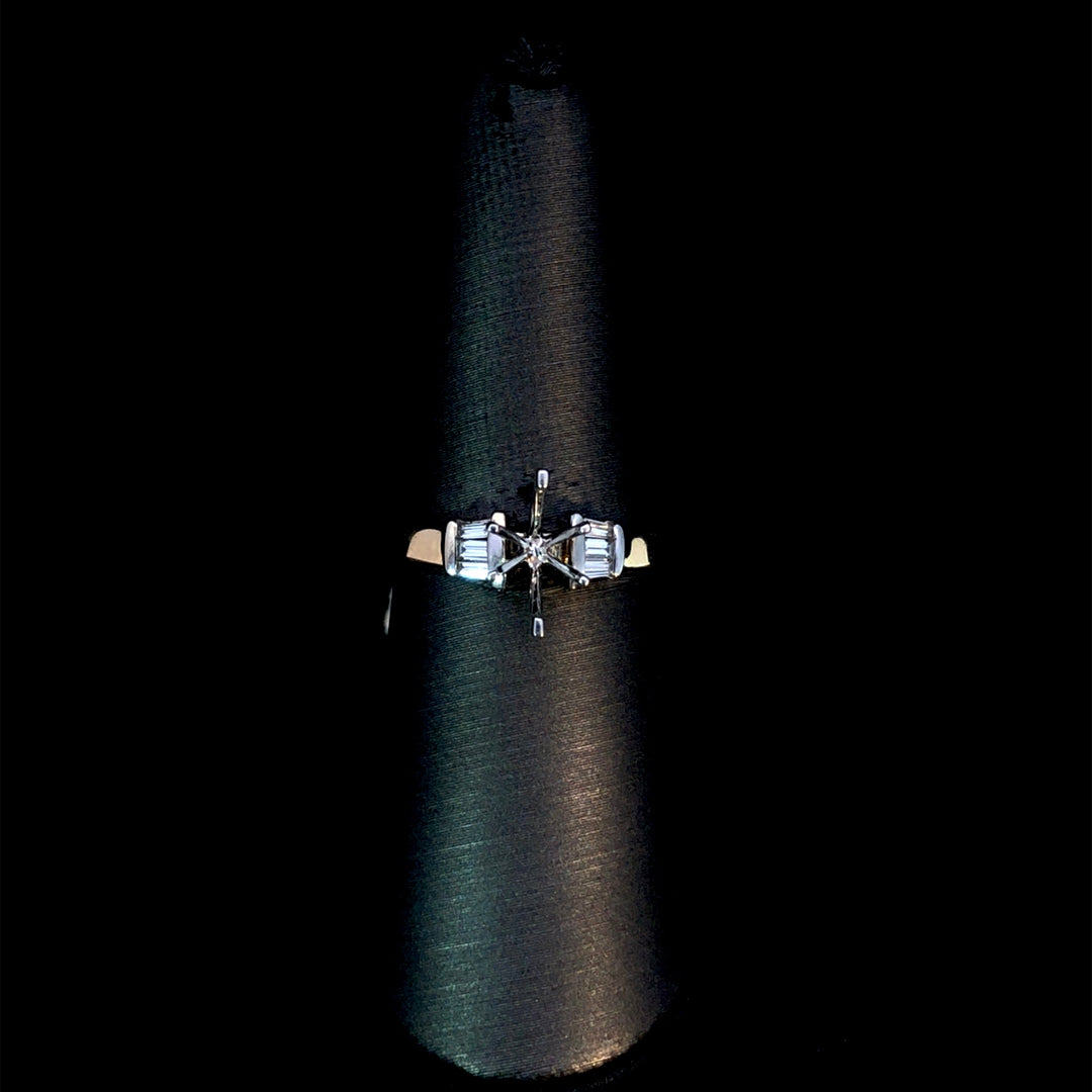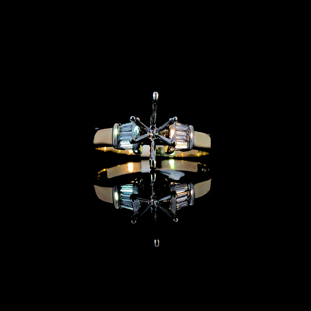 Enhance your jewelry collection with this classic 2-tone semi mount ring, featuring .25ctw of baguette diamonds set in elegant white gold on a smooth 14kt yellow gold band. Designed as the perfect canvas, it invites you to personalize your ring by choosing a center stone from our broad selection of loose stones. Price is for the semi mount only. Center stone will be added at an additional cost. This ring is a size 7. If that size is not a perfect fit, first time sizing is free at the time of purchase. Additional sizing fees may apply.