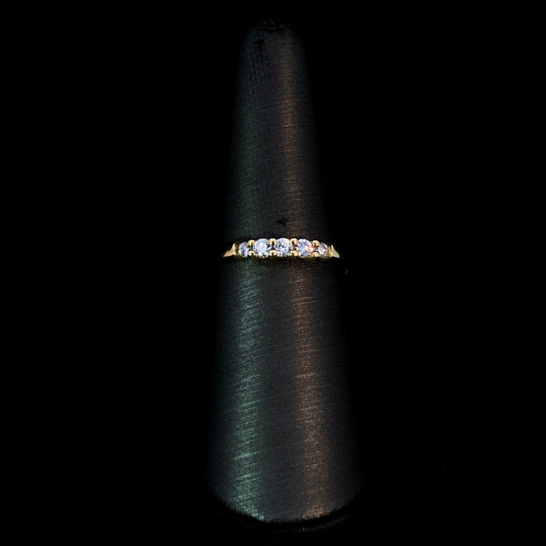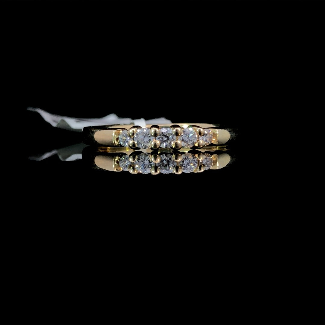 This stunning diamond band boasts 5 round diamonds, totaling .25ctw, set in 14kt yellow gold. The perfect accessory for everyday wear, it adds a touch of elegance and luxury to any outfit. Dazzle and shine with this beautiful piece of jewelry that will surely impress. This ring is a size 7. If that size is not a perfect fit, first time sizing is free at the time of purchase. Additional sizing fees may apply.