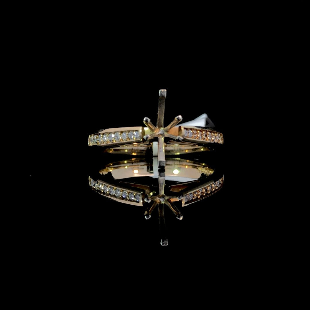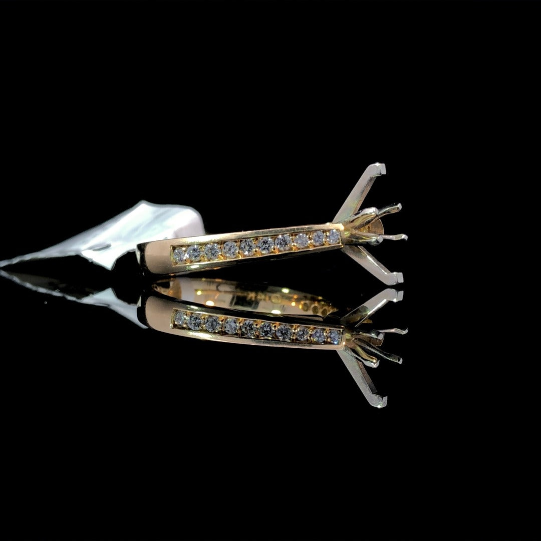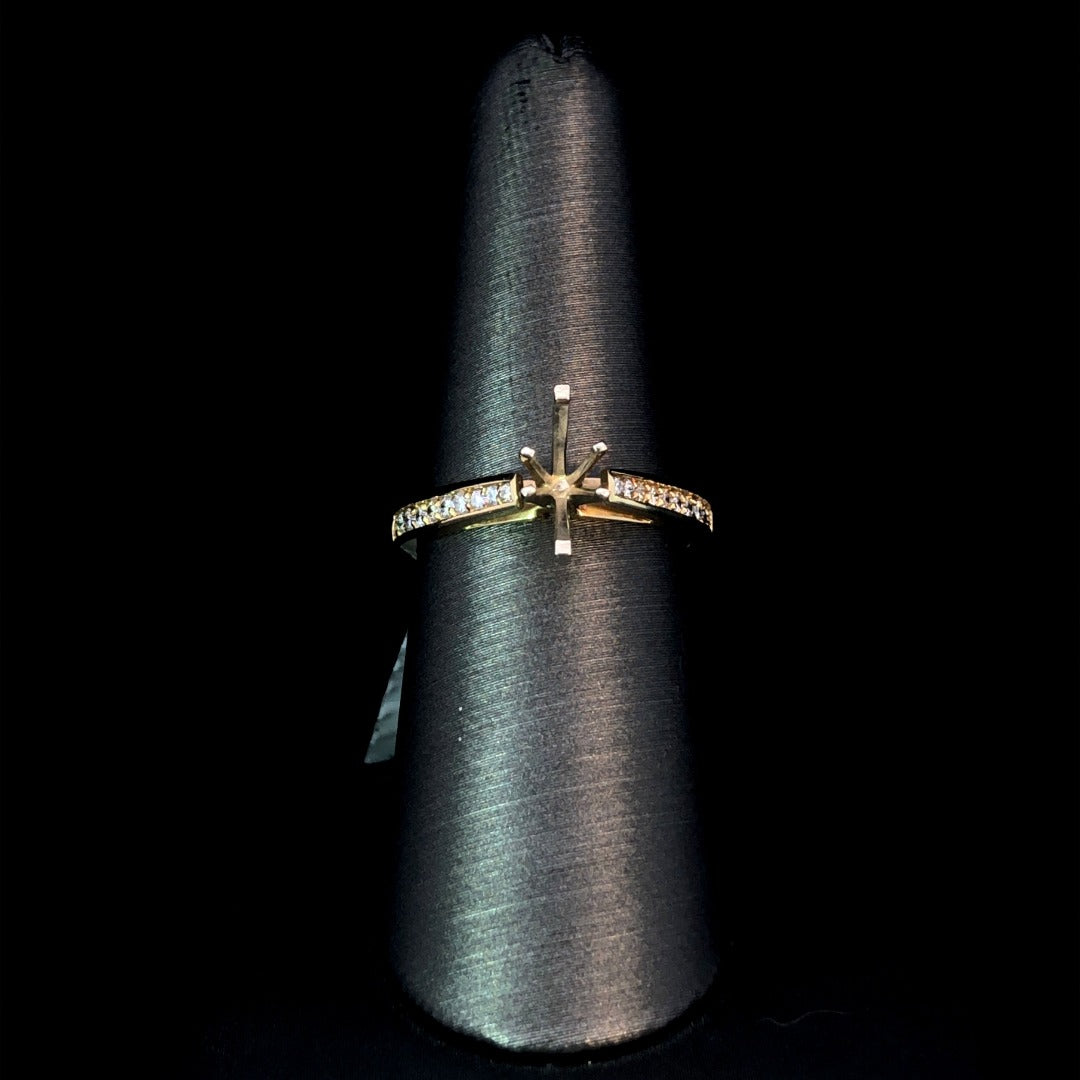 This stunning 14kt yellow gold semi mount showcases .26ctw of sparkling round diamonds cascading down the band. Create a personalized piece by selecting your own center stone from our wide range of loose diamonds. Add elegance to your collection with this classic diamond semi mount. Price is for the semi mount only. Center stone will be added at an additional cost. This ring is a size 7. If that size is not a perfect fit, first time sizing is free at the time of purchase. Additional sizing fees may apply.