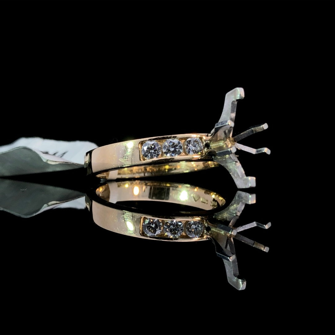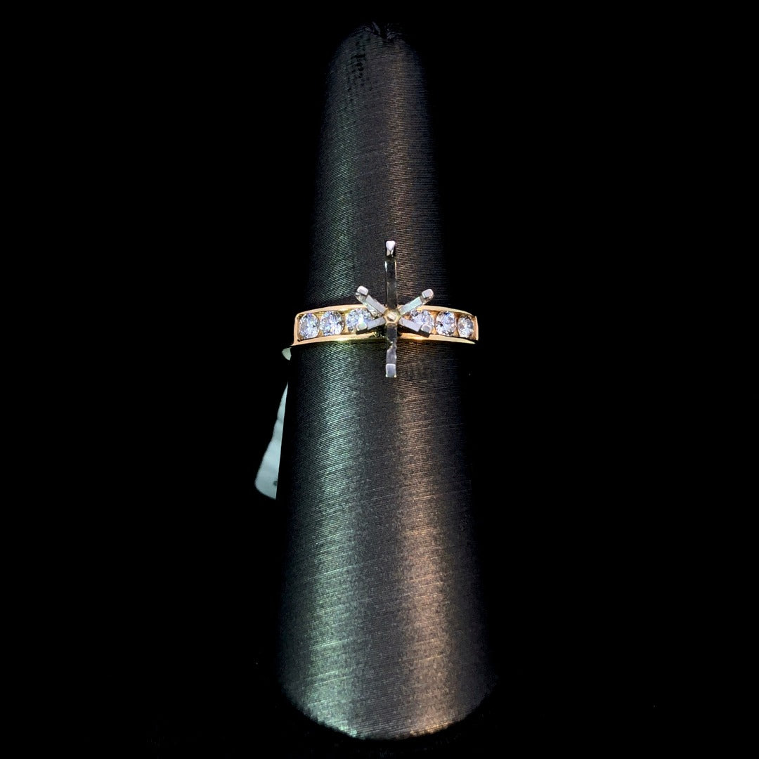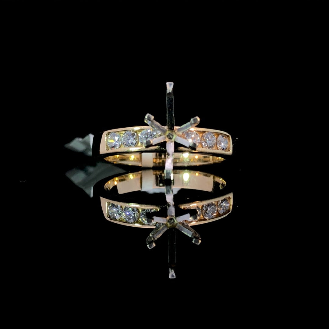 Indulge in timeless elegance with our classic diamond semi mount. Meticulously crafted from 14kt yellow gold, this stunning piece features .36ctw of sparkling round diamonds, channel set to perfection. Choose your perfect center stone from our exquisite selection for a truly one-of-a-kind piece. Price is for the semi mount only. Center stone will be added at an additional cost. This ring is a size 7. If that size is not a perfect fit, first time sizing is free at the time of purchase. Additional sizing fees may apply.