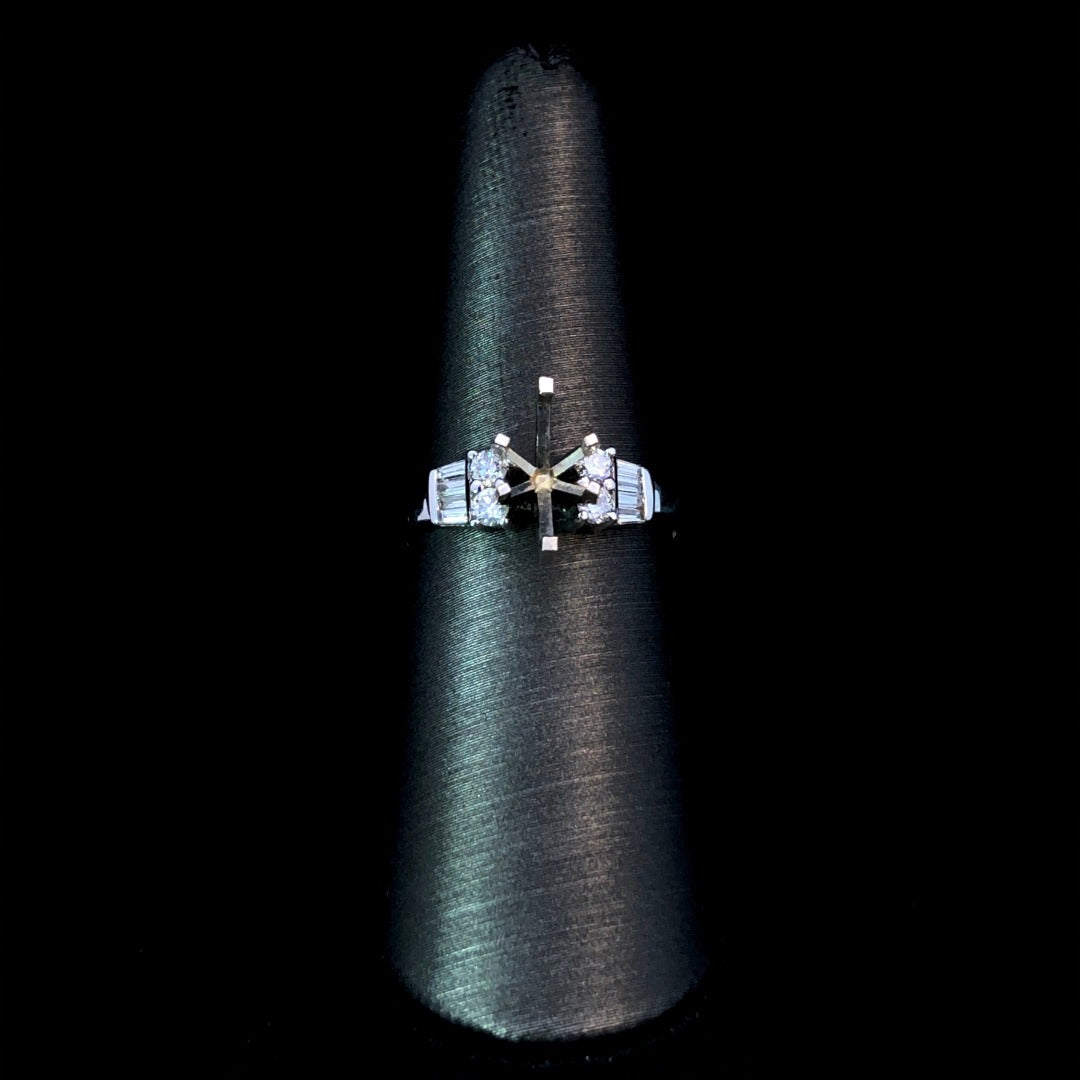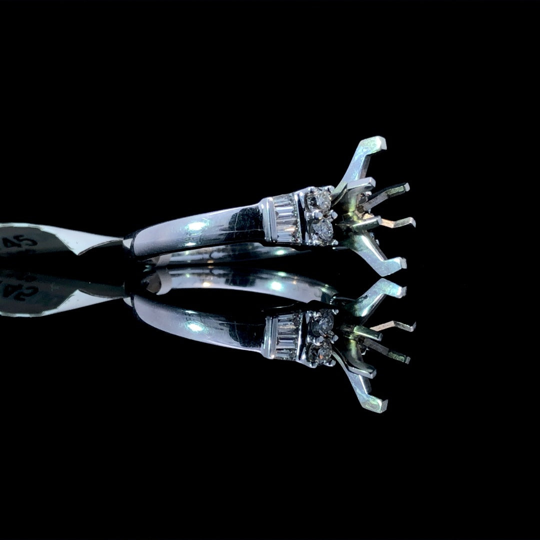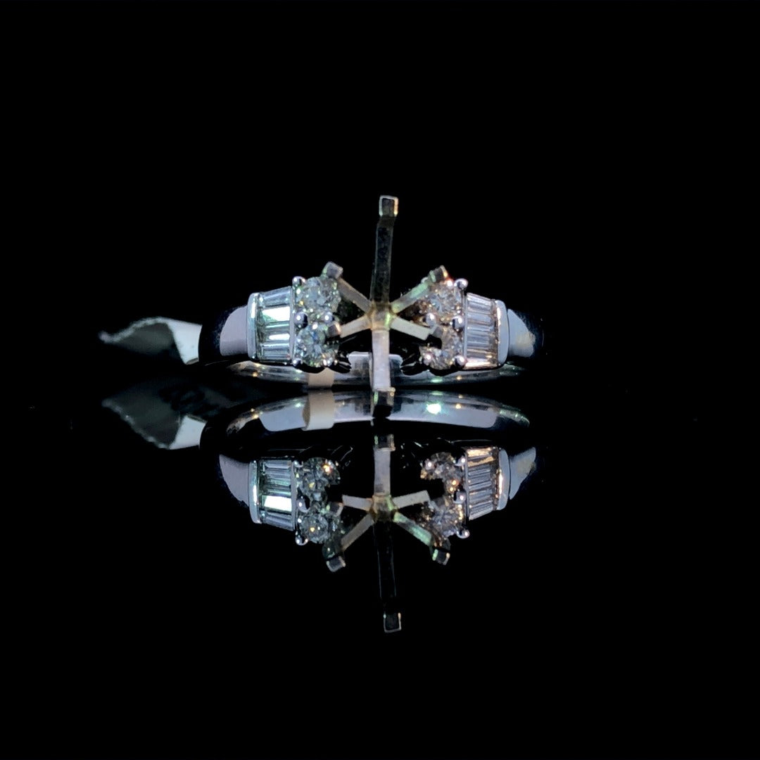 Indulge in timeless elegance with our beautiful diamond semi mount. Crafted from 14kt white gold, this classic piece features .37ctw of sparkling round and baguette diamonds on the sides. Choose your perfect center stone from our unmatched selection to create the ultimate bespoke design. Price is for the semi mount only. Center stone will be added at an additional cost. This ring is a size 7. If that size is not a perfect fit, first time sizing is free at the time of purchase. Additional sizing fees may apply.