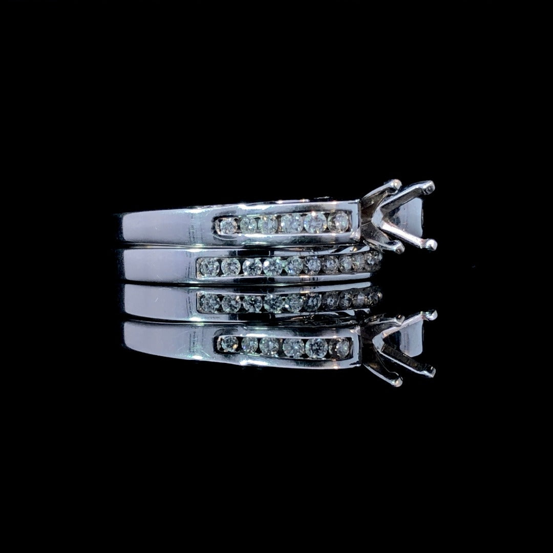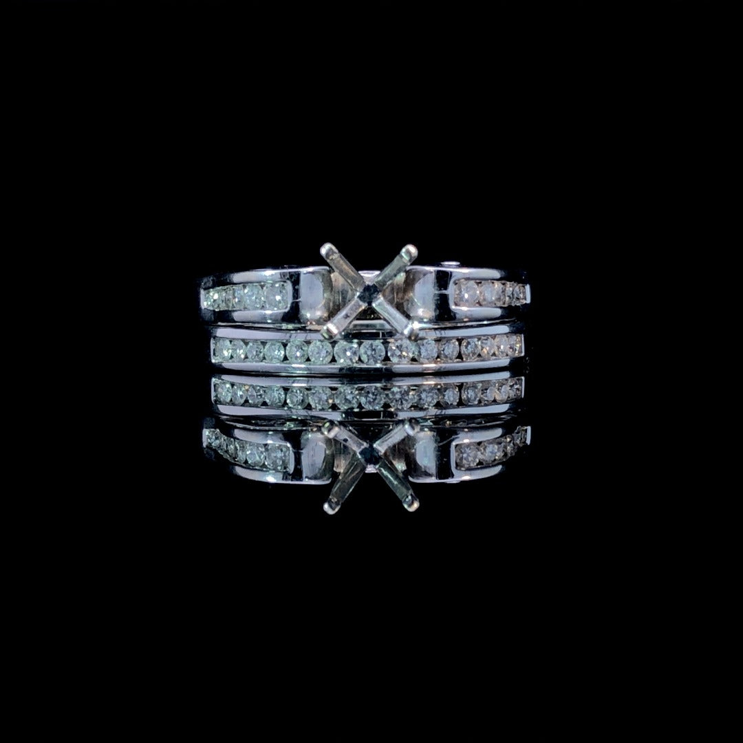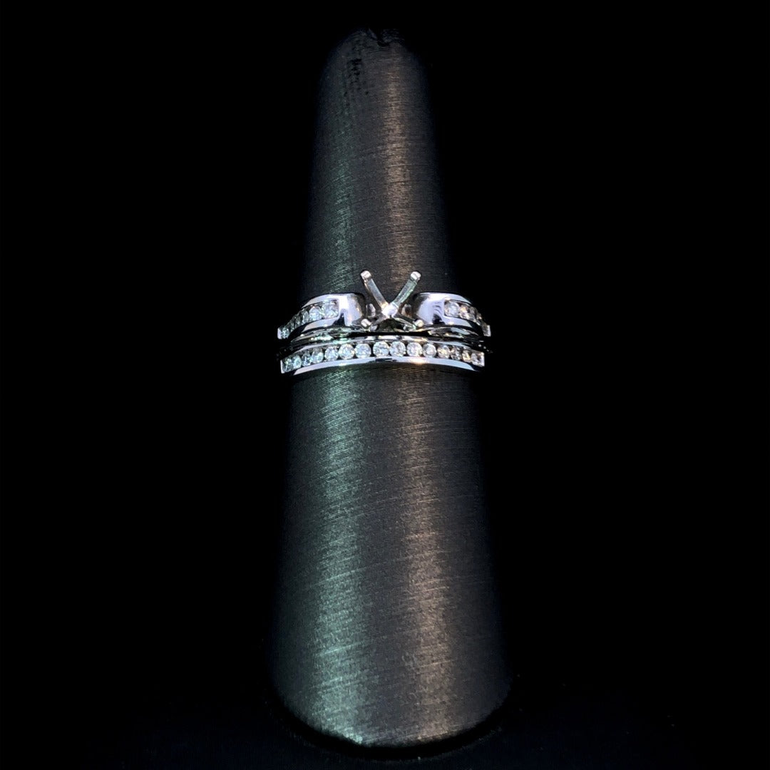 Indulge in luxury with our beautiful diamond semi mount and band set. Crafted in 14kt white gold, this classic design features .50ctw of sparkling round diamonds. The intricate swirl detail adds an elegant touch. Personalize it with your choice of center stone from our vast collection for a truly exclusive piece. Price is for the semi mount only. Center stone will be added at an additional cost. This ring is a size 7. If that size is not a perfect fit, first time sizing is free at the time of purchase. Additional sizing fees may apply.