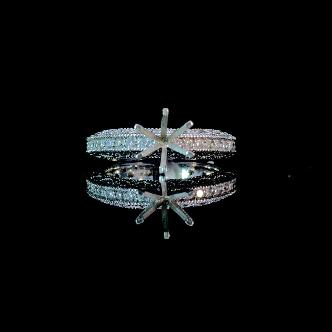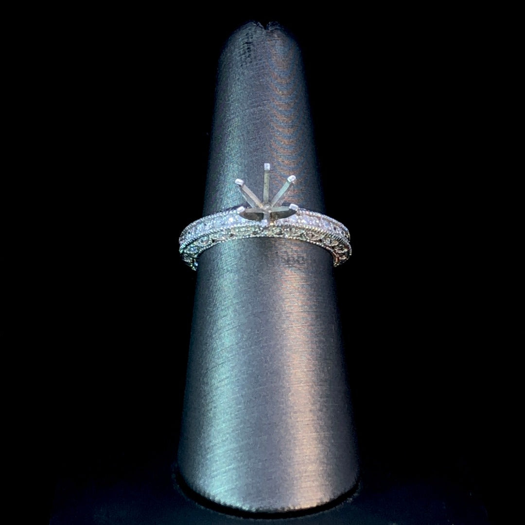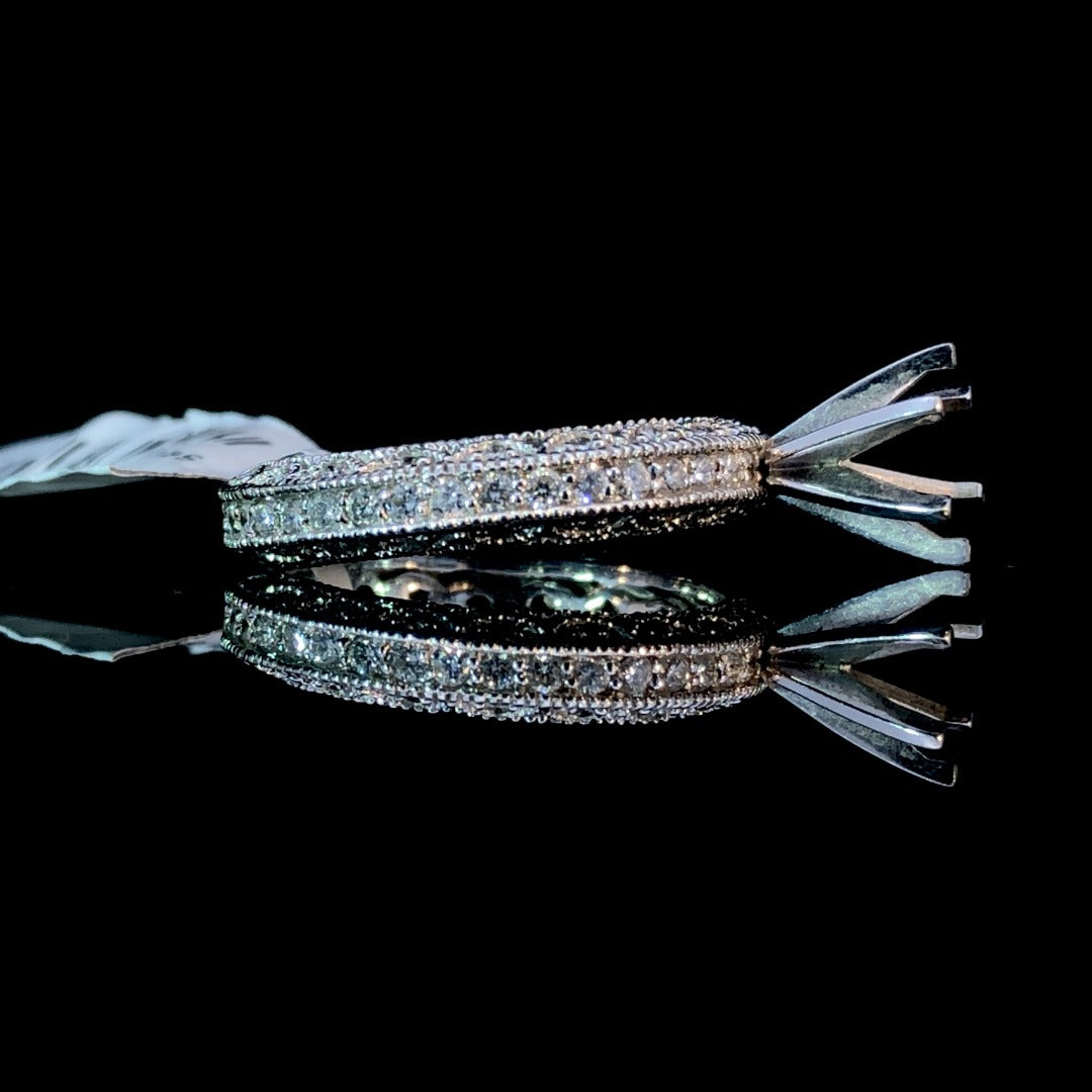 This exquisite 14kt white gold semi mount is adorned with a dazzling .72ctw of dazzling round diamonds, masterfully complemented by radiant milgrain detailing. A timeless classic, the captivating sparkle of this diamond ring will be treasured for generations. Price is for the semi mount only. Center stone will be added at an additional cost. This ring is a size 7. If that size is not a perfect fit, first time sizing is free at the time of purchase. Additional sizing fees may apply.
