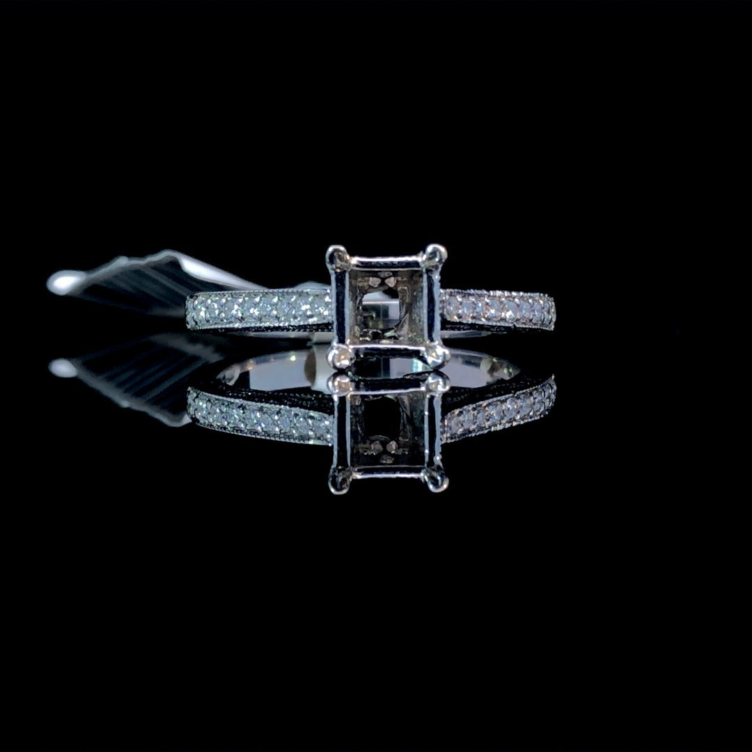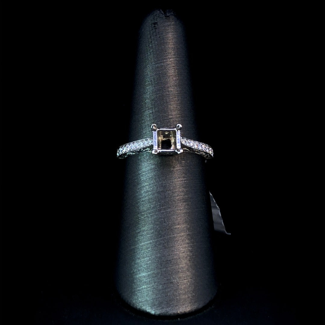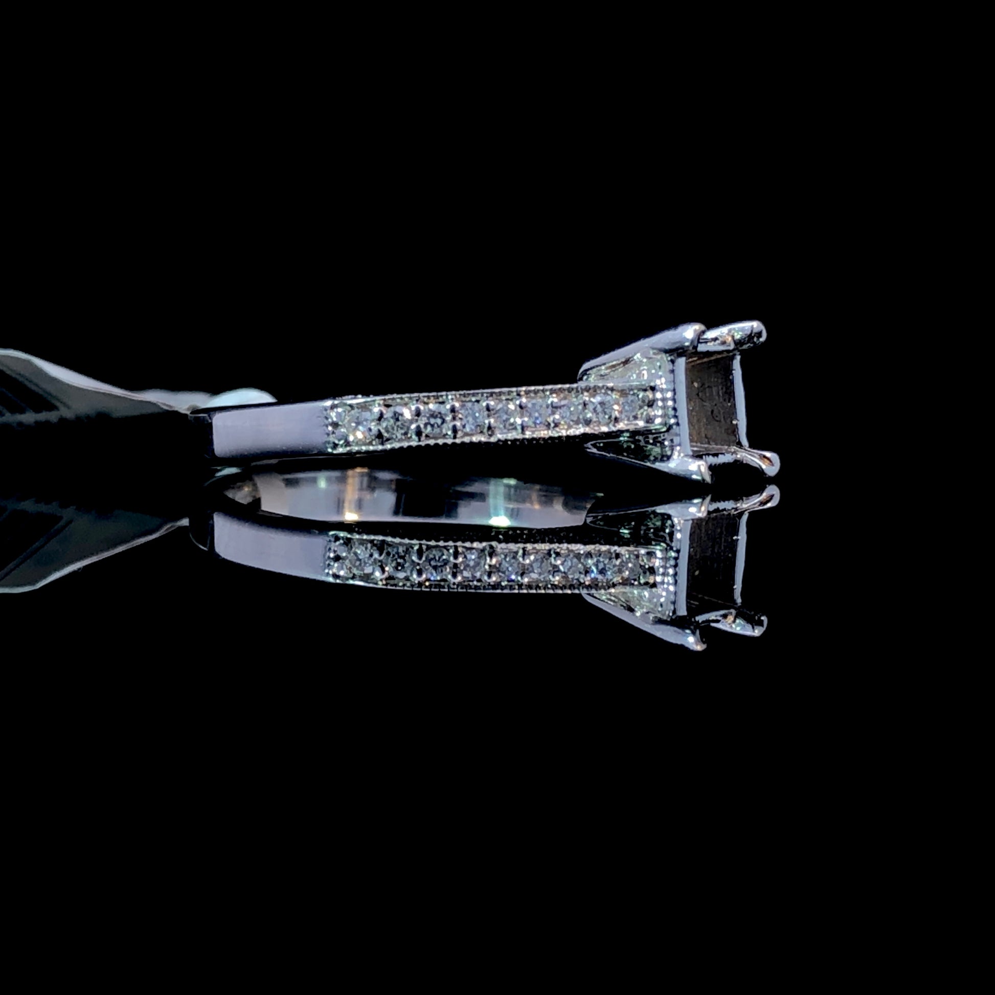 Indulge in luxury with this beautiful diamond semi mount. Enhanced with intricate filigree and milgrain detail, this classic design exudes sophistication. Adorned with .14ctw of round diamonds along the band, simply select your desired square center stone from our unmatched loose stones collection to complete this breathtaking ring. Price is for the semi mount only. Center stone will be added at an additional cost. This ring is a size 7. If that size is not a perfect fit, first time sizing is free at the time of purchase. Additional sizing fees may apply.