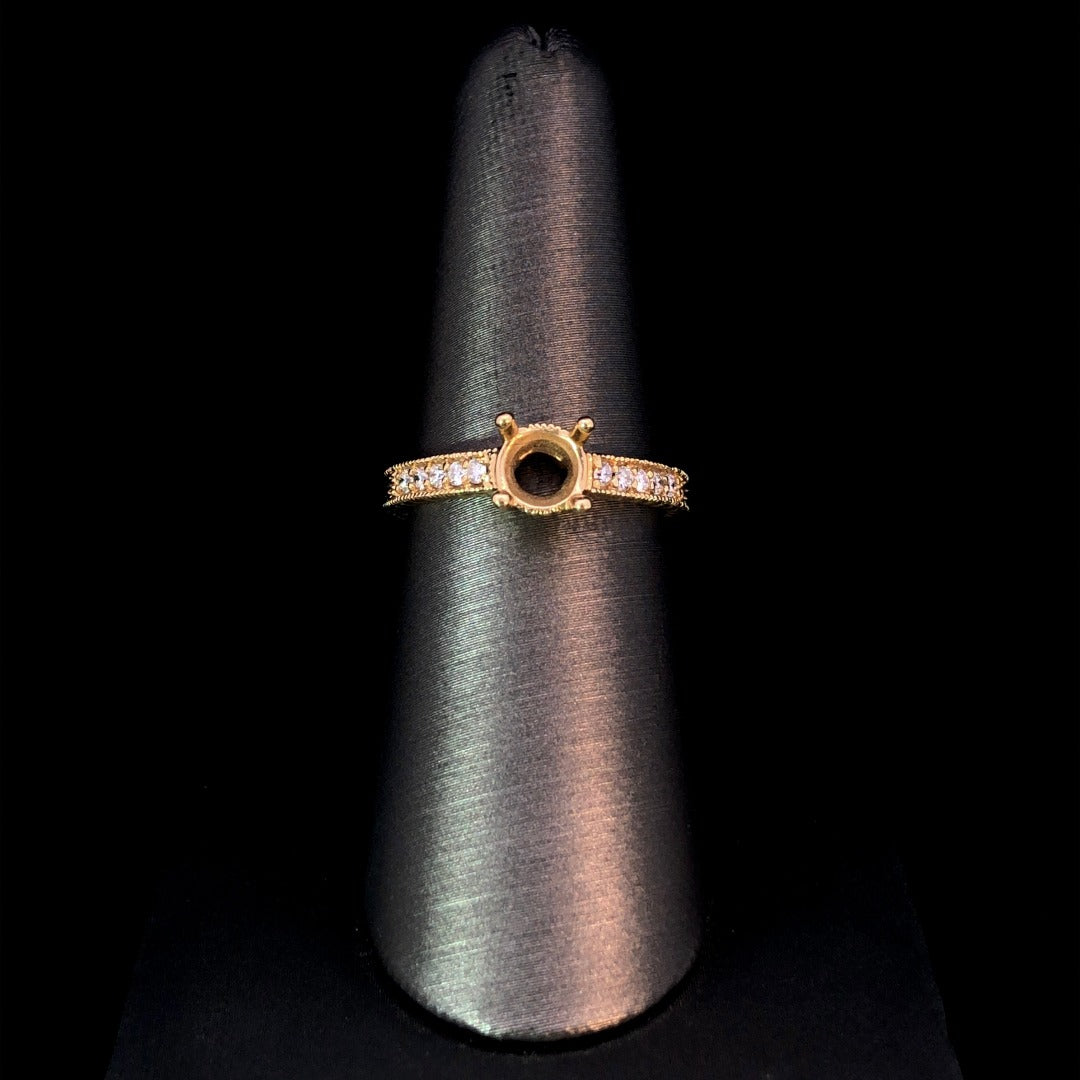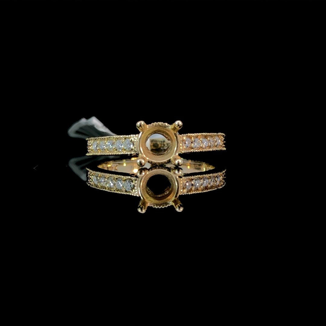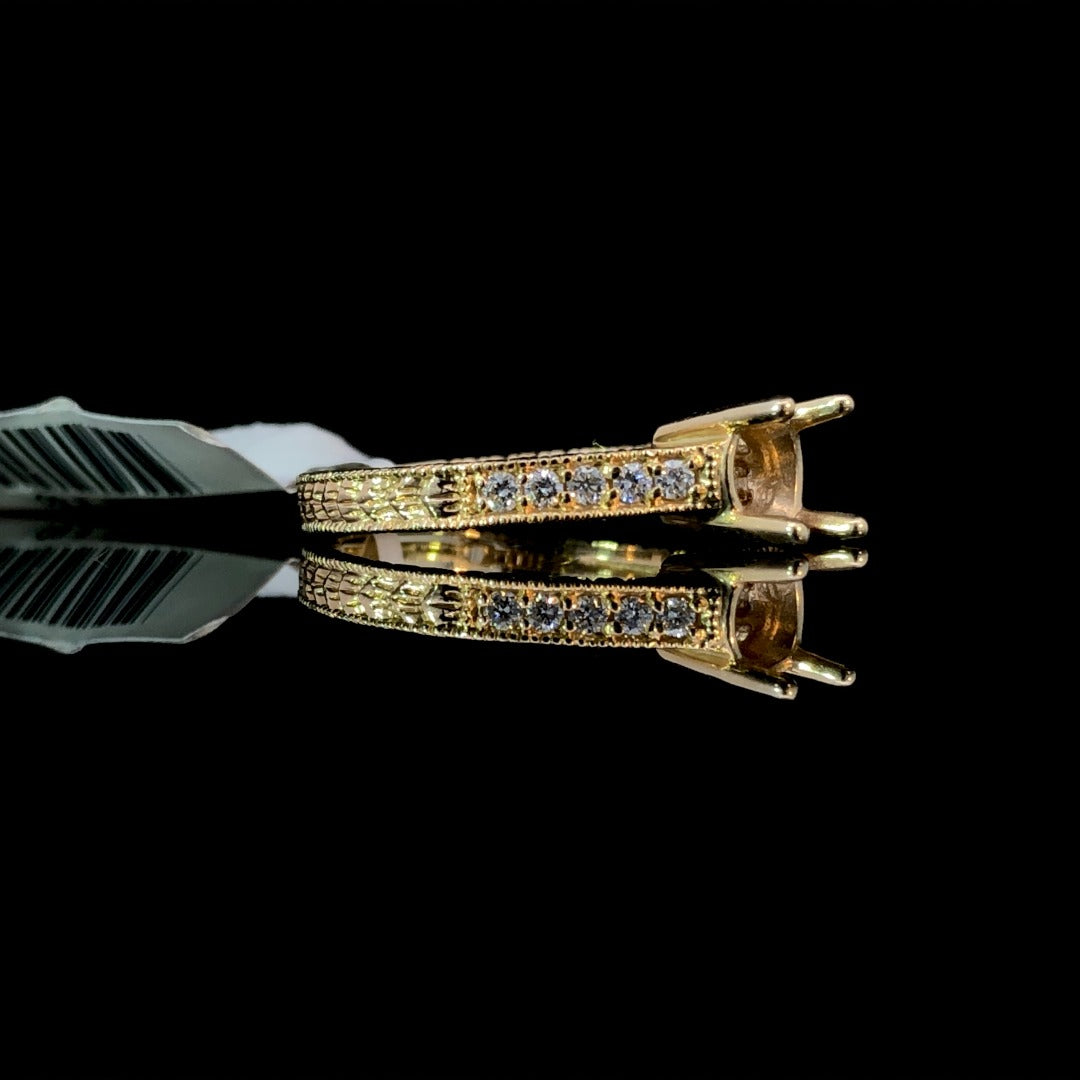 Elevate your style with our gorgeous diamond semi mount. The exquisite 14kt yellow gold setting boasts .17ctw of round diamonds, intricate detailing, and milgrain. Personalize it with your choice of center stone from our vast selection. A stunning piece for those who value true elegance. Price is for the semi mount only. Center stone will be added at an additional cost. This ring is a size 7. If that size is not a perfect fit, first time sizing is free at the time of purchase. Additional sizing fees may apply.