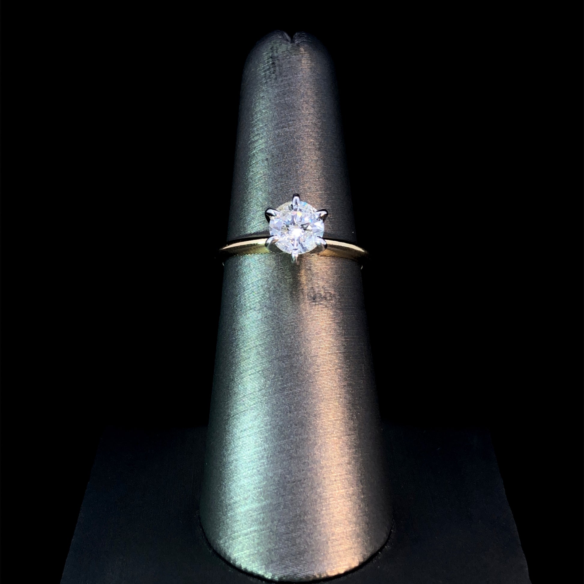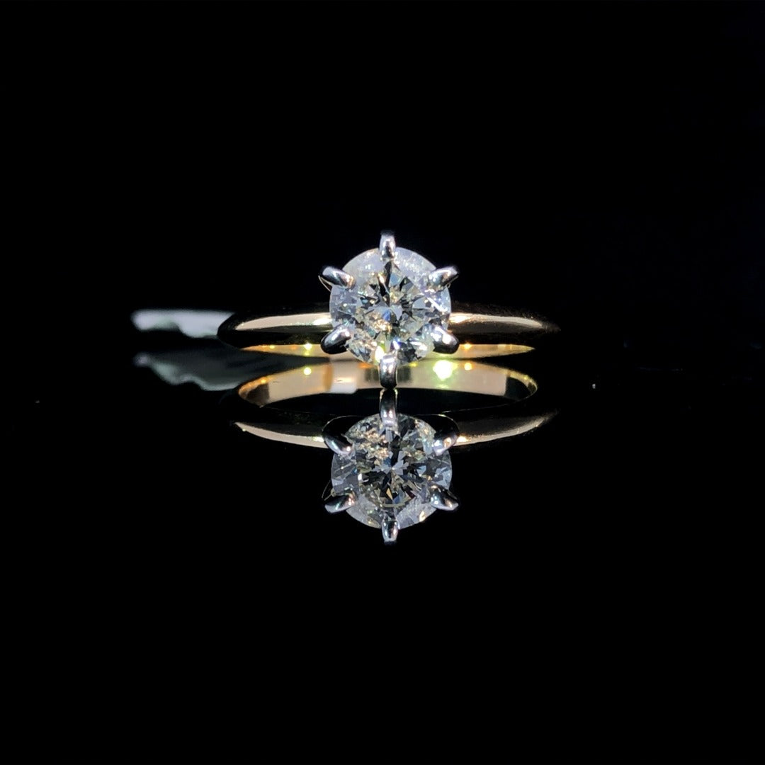 This timeless solitaire ring marries classic and contemporary with its brilliant .96 carat round diamond set in a striking white gold head atop a 14 karat yellow gold band. A luxurious and exquisite piece, this diamond ring is sure to capture admiration for its breathtaking elegance. This ring is a size 6. If that size is not a perfect fit, first time sizing is free at the time of purchase. Additional sizing fees may apply.
