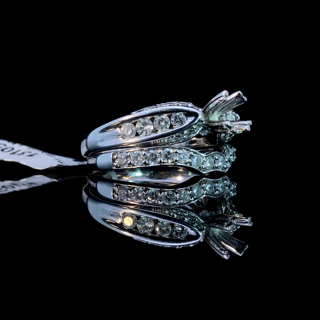 Indulge in luxury with our gorgeous diamond engagement ring set. Crafted in 14kt white gold, the stunning semi mount boasts sparkling round diamonds. Complete the look with your choice of center stone from our extensive collection. Also included is a matching diamond contour band for a total weight of 1.03ctw. Elevate your love story with this exclusive and timeless piece. Price is for the semi mount only. Center stone will be added at an additional cost. This ring is a size 6.75. If that size is not a perfect fit, first time sizing is free at the time of purchase. Additional sizing fees may apply.